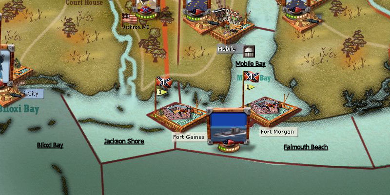 As I said, the double adjacency rule is a rule of thumb, not an absolute rule. This means that naval units moving from Biloxi Bay into Jackson Shore can be bombarded from Fort Gaines, but it is much less likely. The same goes for units leaving such an adjacent river or coastal region. As the CSA if you've ever sent naval units past Fort Monroe - and you probably have - you know that you either get a message saying the you successfully bypassed the Fort Monroe batteries or that you were bombarded by them.