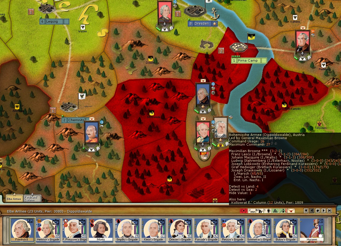 The very first months of the war and the remaining season of 1756 - I guess until November or December, when troops go into winter quarters - is dedicated to the destruction of the Saxon army and the subjugation of what remains of the country. The Saxon army is concentrated in Pirna and the challenge is to destroy them before sizeable Austrian forces intervene. I don't know how large this remaining army is, but the tooltip information over the Pirna camp icon lists 16 units. (Who knows the exact size of this Saxon contingent?)