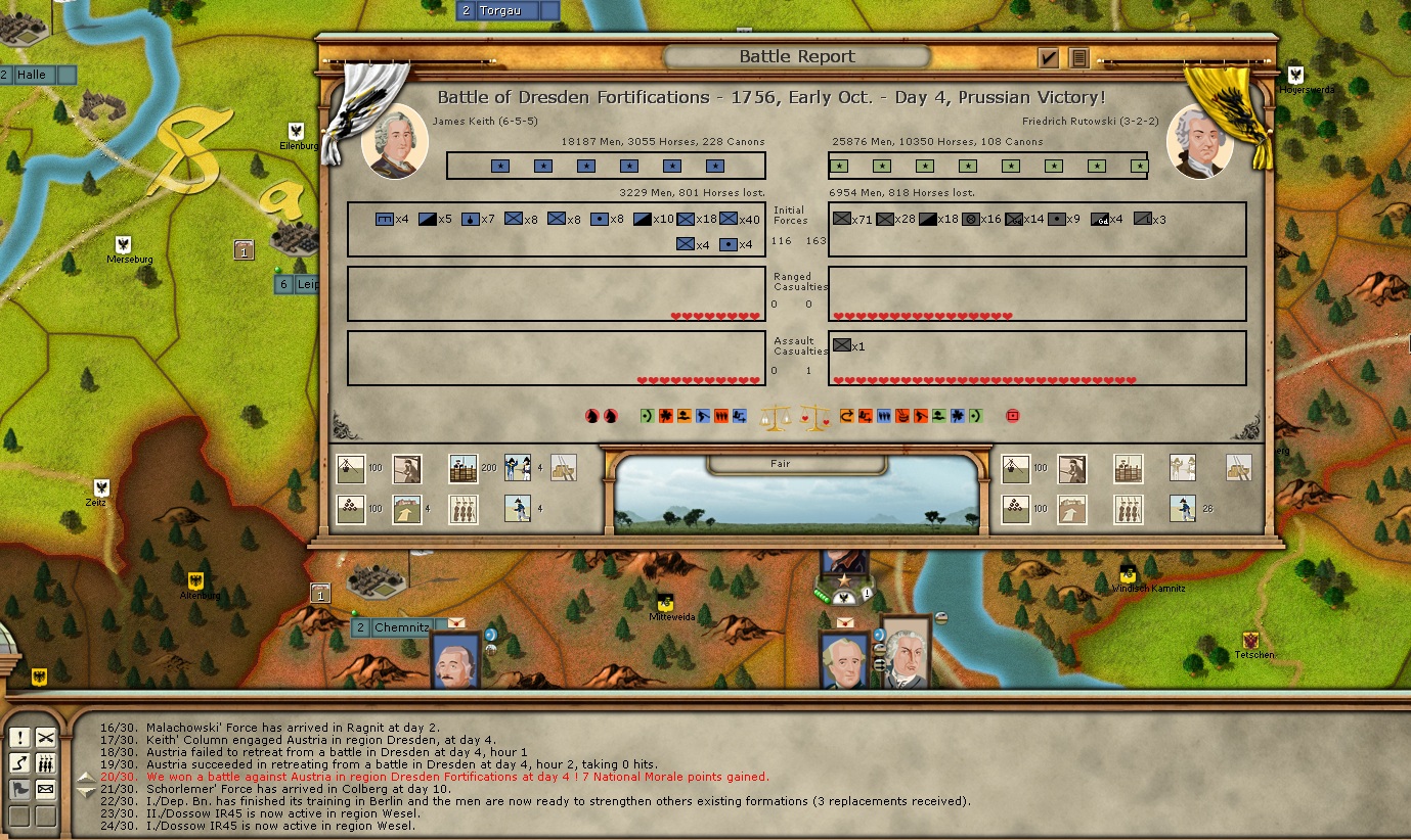 What happened? Saxony may a desparate sortie out of Pirna into the direction of Dresden but was beaten back by Keith (who was there exactly for this eventuality). That was fine - although I lost over 3000 men and 801 wonderful horse against an enemy who was already doomed, but apparently did not know it himself. (In game terms: a good decision by the AI!) The Saxons did not yet surrender.