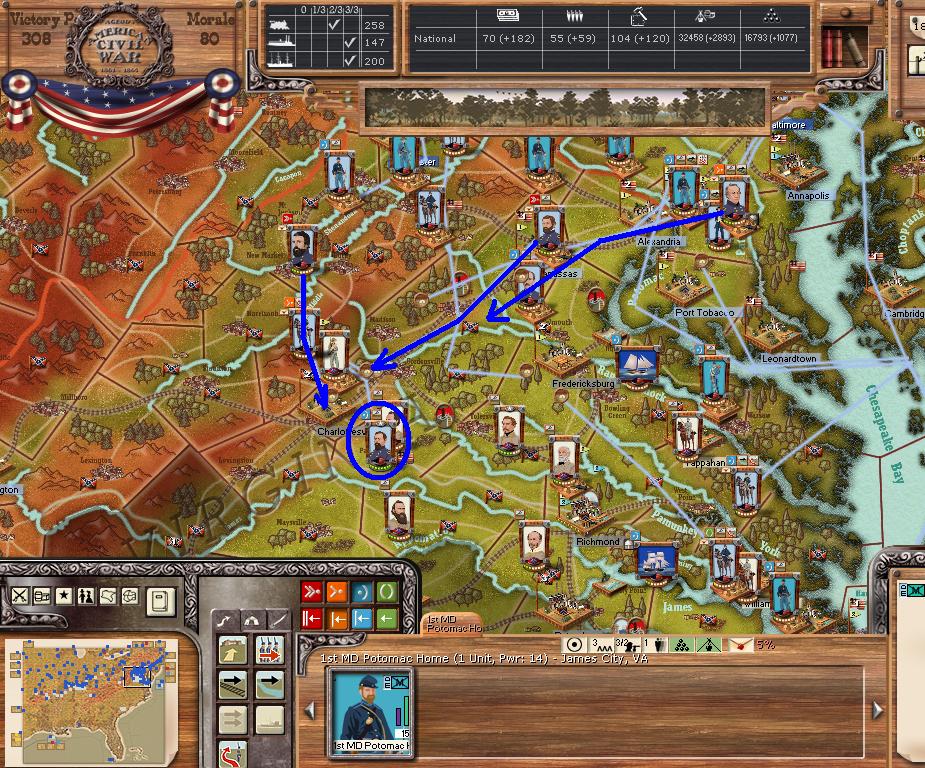 Orders - Johnston & McCulloch to Culpepper, Major reinforcement of the AOP at Richmond. In the west, troops are gathering at Nashville, and Memphis. Price gathers his command at Ft. Smith AR with the addition of many troops. Manstein is going heavily into independent artillery units (purchasing 20 units in the last 2 turns).