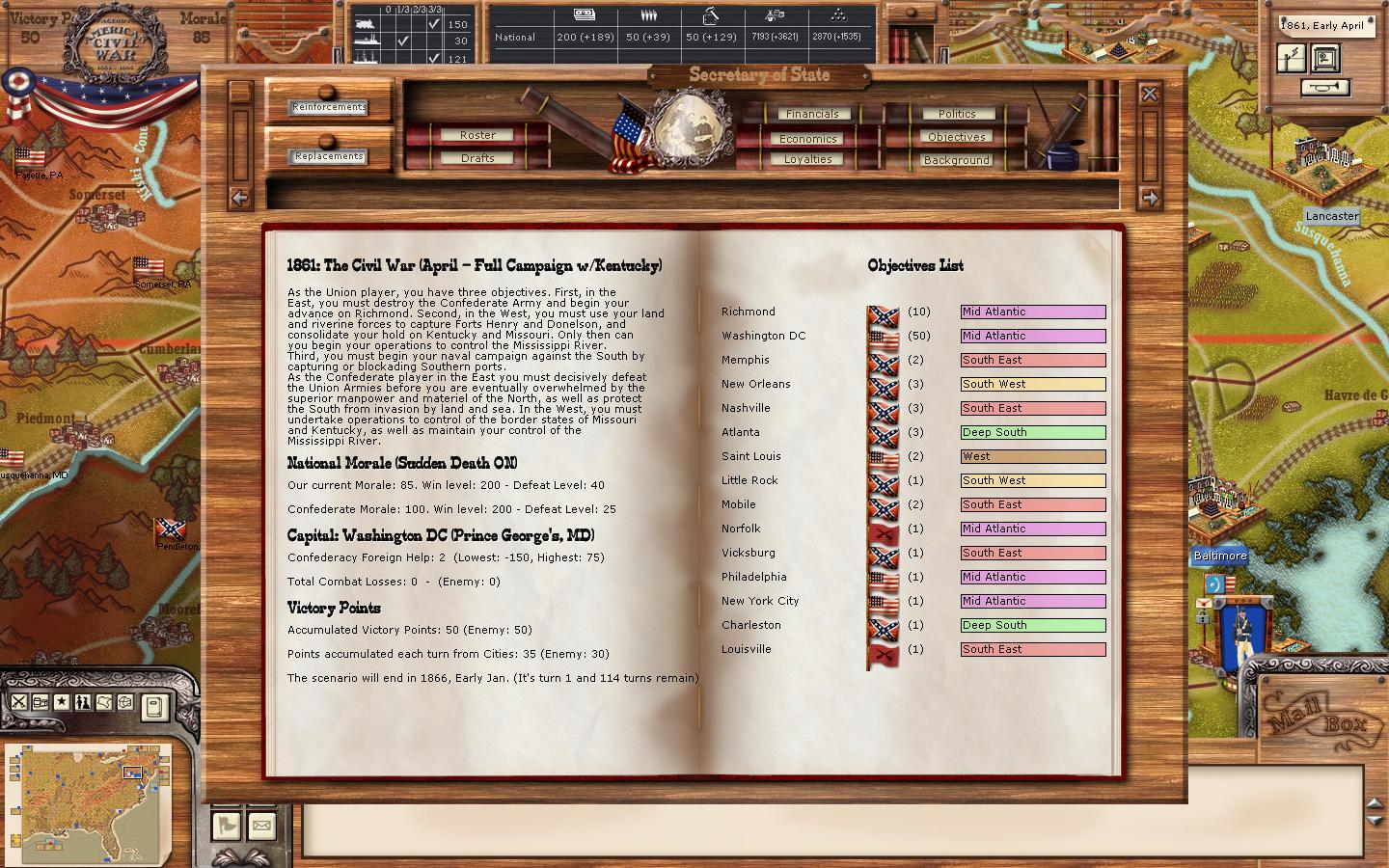 1 - Take Manassas in the early fall of 1861 - looking to move later August - to avoid the 10NM penalty.