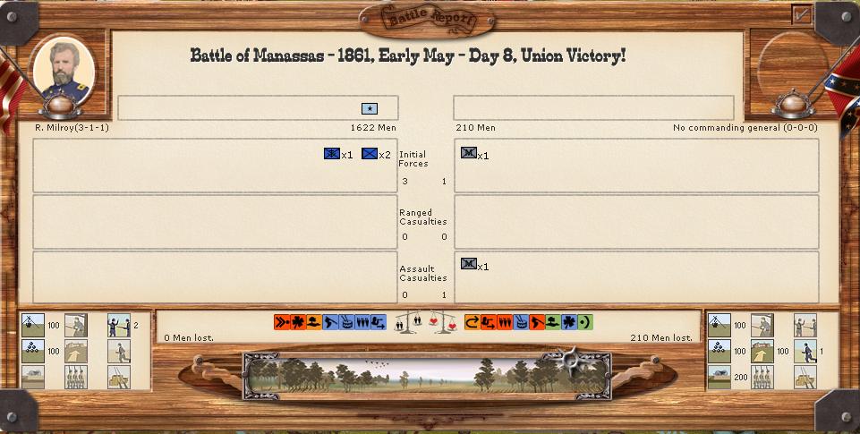 My initial plan is to hold back until early August and then unleash the army of the potomac to seize Manassas (hoping that Fusilleer allows this of course).