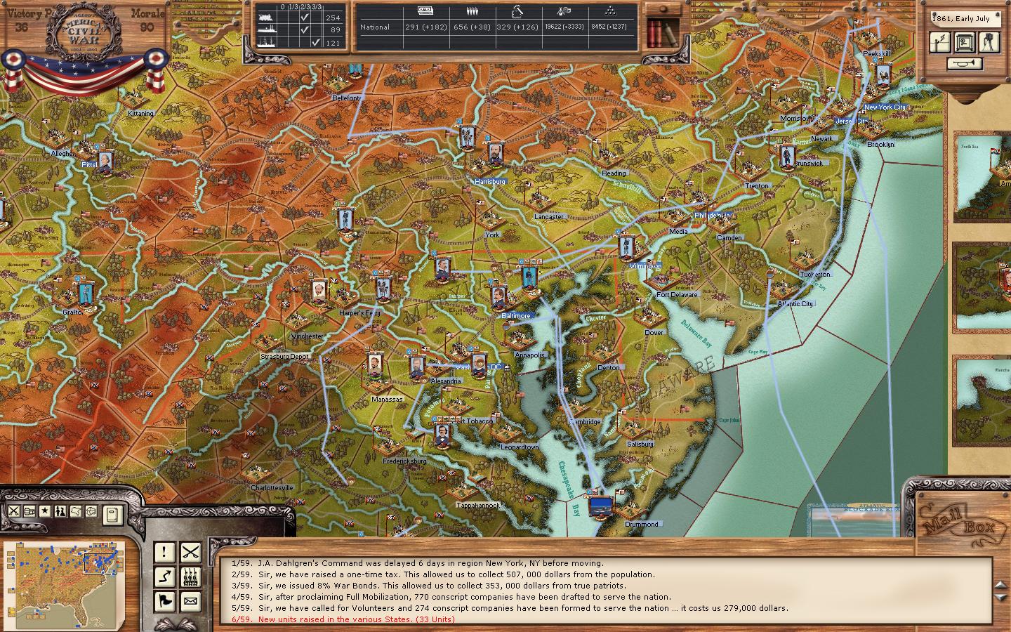 With this in mind I will look to create some mobile division commands to serve two purposes - push the ranks of the leading generals as well as tie up CSA troops fending off the advances of these forces. If I can keep Fusileer keeping one eye looking over his shoulder, I'll at least stand a chance of bringing the material and resource superiority to bear later in the game.