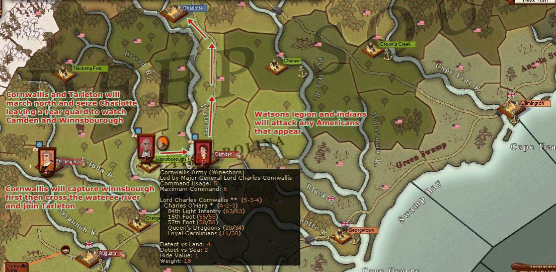 Both Cornwallis and Tarleton have engaged the enemy and gave then a damn good thrashing inflicting heavy losses on the Americans for light losses to themselves the advance on Cherlotte continues.