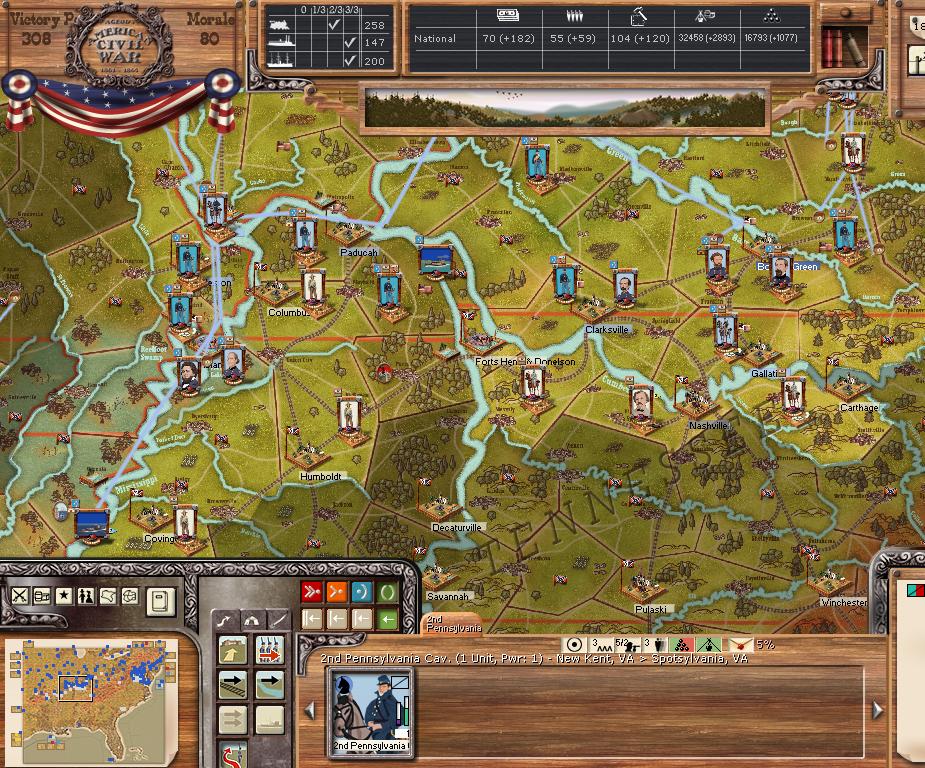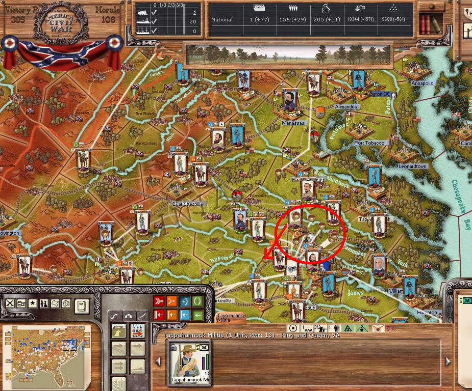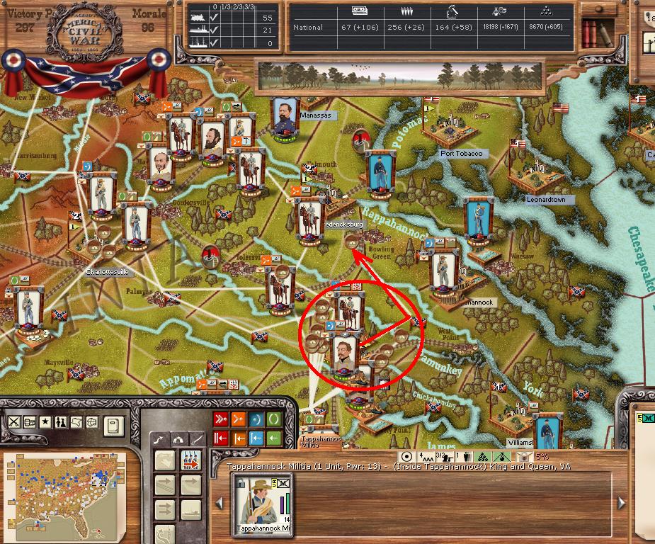 Orders - The NVA was forced east right into the pursuing CSA forces. I have included a picture of McDowell's plight (he has no supply, and can't move anywhere). Due to the supply wagons, he does not have enough evasion points to move anywhere (hence the giant red map). His choices are 1-move with his supply wagons(he can't move into any region as is), and hope Grant bulls through the ring of CSA forces allowing him an escape route, or 2-dump his supply wagons, and run away (allowing him to move into a different map region). Neither appears to be a particularly good end for what was a bold stroke to cut off Richmond. Johnnycai has choosen option 1, with the NVA attempting to move west then NW to Charlottesville (we will see what happens as a result). Grant is pushing SE to attack Longstreet/Jackson. In the west, the union is now under threat of the uprising of CSA support, and so Wood will have to move back to restore order to Bowling Greene (this is an odd result due to the Kentucky secedes event). Lyon will now move north and west (away from Ft. Smith)