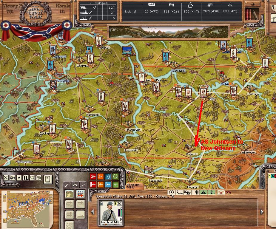Orders - AOP and other commands will move north and west to surround the NVA. Jackson will hold, and attempt to attack the NVA. An Army HQ is sent out west to Nashville, where AS Johnston is waiting. Now that the river threat is smashed for a while, Bragg's division is moving by rail to Nashville.