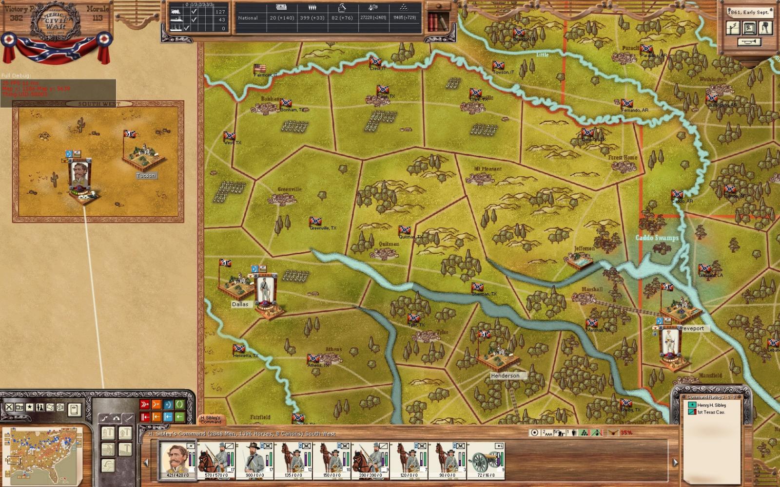 Looks like the Sam Houston event in Texas fired, so have to deal with that now. B. McCulloch with some calvary are dispatched to attack Dallas, along with another lone calvary. I have a 6lb artillery on the way and as soon as I can build some units in Texas will start my move in the West blitzkrieg style.