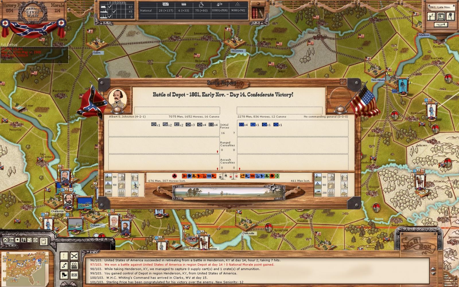 Hardee loses to Grant. However, Hardee has a division as well as Mculloch in the area, so this should be enough to keep Grant busy. He left Columbus KY undefended for the most part, but I'm not going to jump at it right now. Grant isn't moving far.