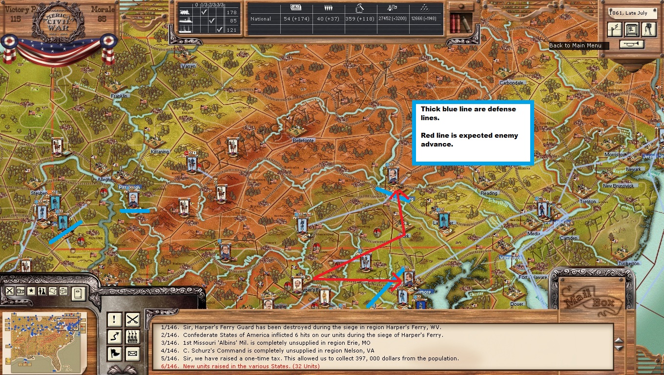 4: Entrench Pittsburg, Wheeling, Harrisburg, Washington, Baltimore, Annapolis, Wilmington. Make forts there if possible.