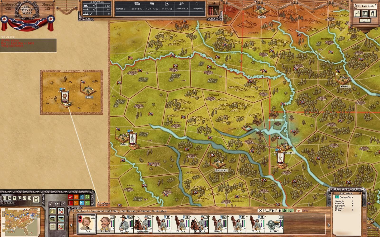 Snapshot of Northern and West Virginia. Nothing going on much here. My patrolling brigade on the rail between Grafton and Harpers Ferry is winning every battle so far. JJ is going West to set up his Army at Nashville. Additional 12lb artillery are moving up to strengthen my defenses in this area. It should serve me well on defence.
