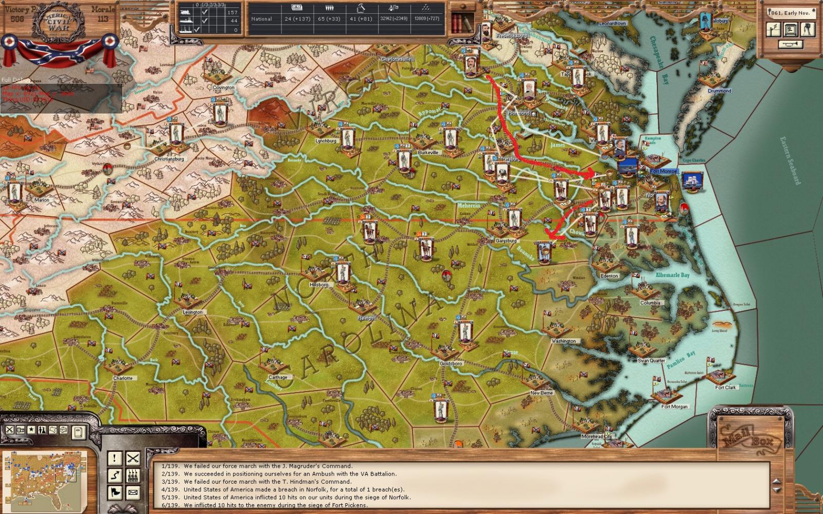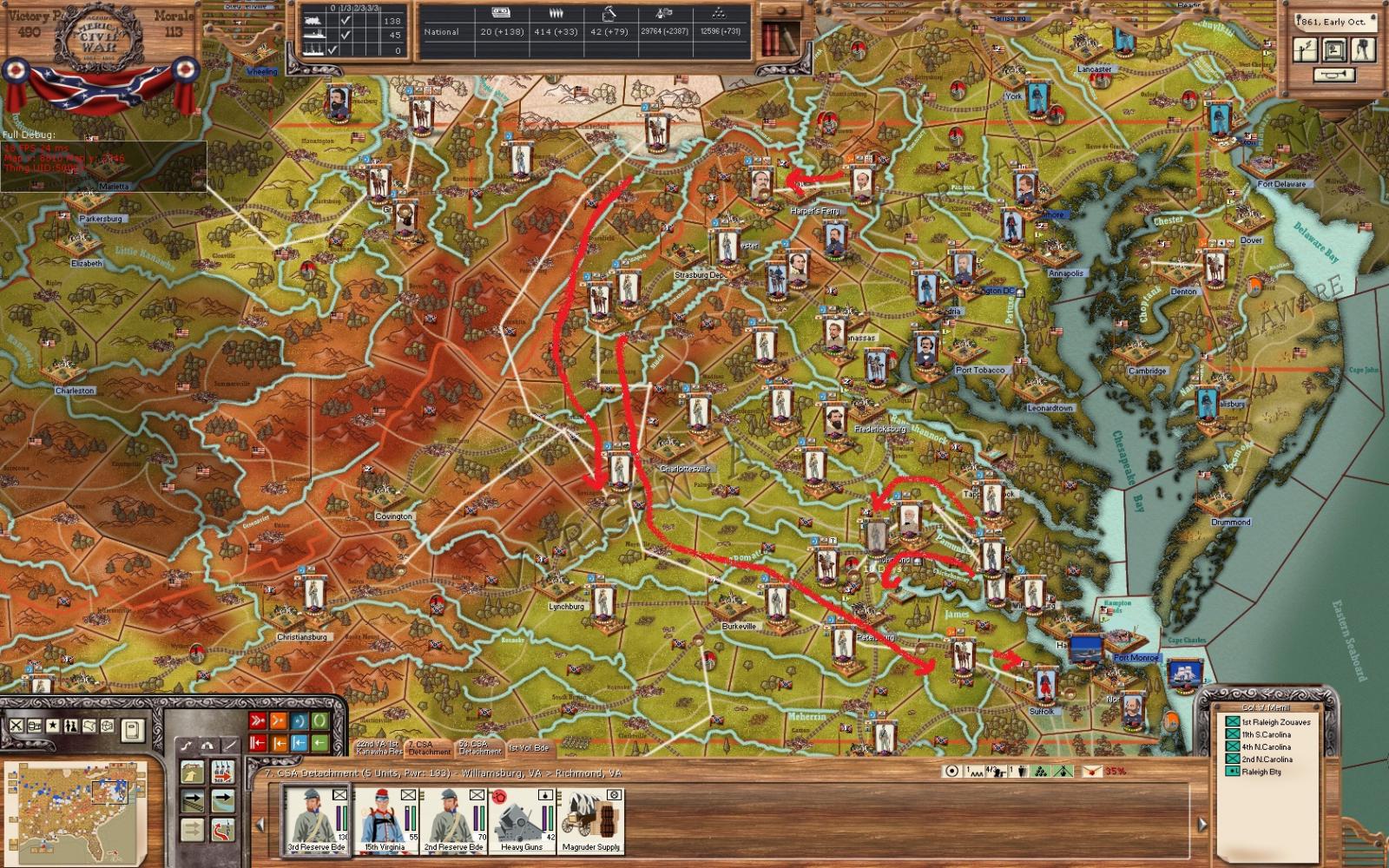 I'm going to leave one division in Williamsburg and pull Jackson and Mcgruder back soon. They both need to command corps. A fort will be built at Williamsburg soon as well protecting that avenue of approach to Richmond. I am moving Bee's division back to Petersburg, one to protect the area should my opponent try to land there. He could with the fleet he has. Bee will also be in a position to respond to attacks quickly in NC and SC while being off the radar to my opponent. I'm debating on sending Smith's corp to Leesburg region, mainly for MTSG benefit, but going to wait one turn to see what moves the enemy makes.