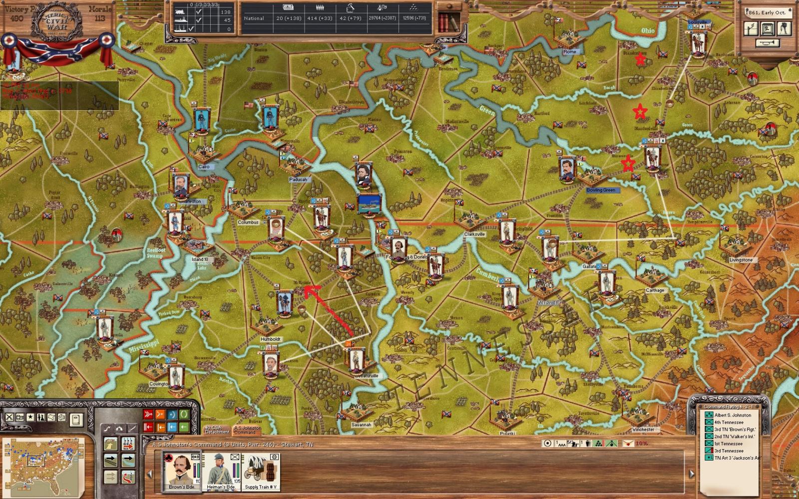 AJ is moving West and will be Grants nemesis. If he can't handle Grant I will send Lee there to deal with him. JJ will move to Bowling Green to start forming the Army of the TN with corps. Stewarts is holding strong in Lexington, KY. My opponent really needs to clear me out of there unless he wants to tie up forces to contain me. If I lose the area, I'll just retreat slowly through Clarksburg and then cause some trouble from there.