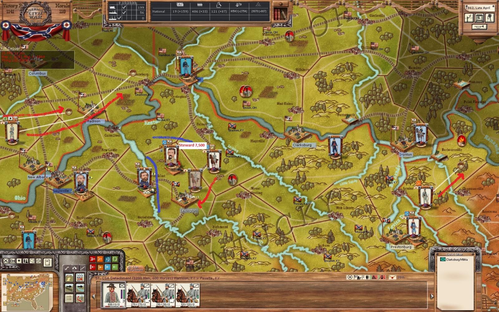 Hindman is going to stay put for a turn. I may move him to take St. Josephs or to dig in at Fort Levenworth, depending on what the enemy units at Lexington do. The enemy forces in Omaha City I expect to just starve out. I think having the depot at Council Bluffs is a good position. Watie is moving to attack some enemy militia off map and get some more experiance for his little indians.
