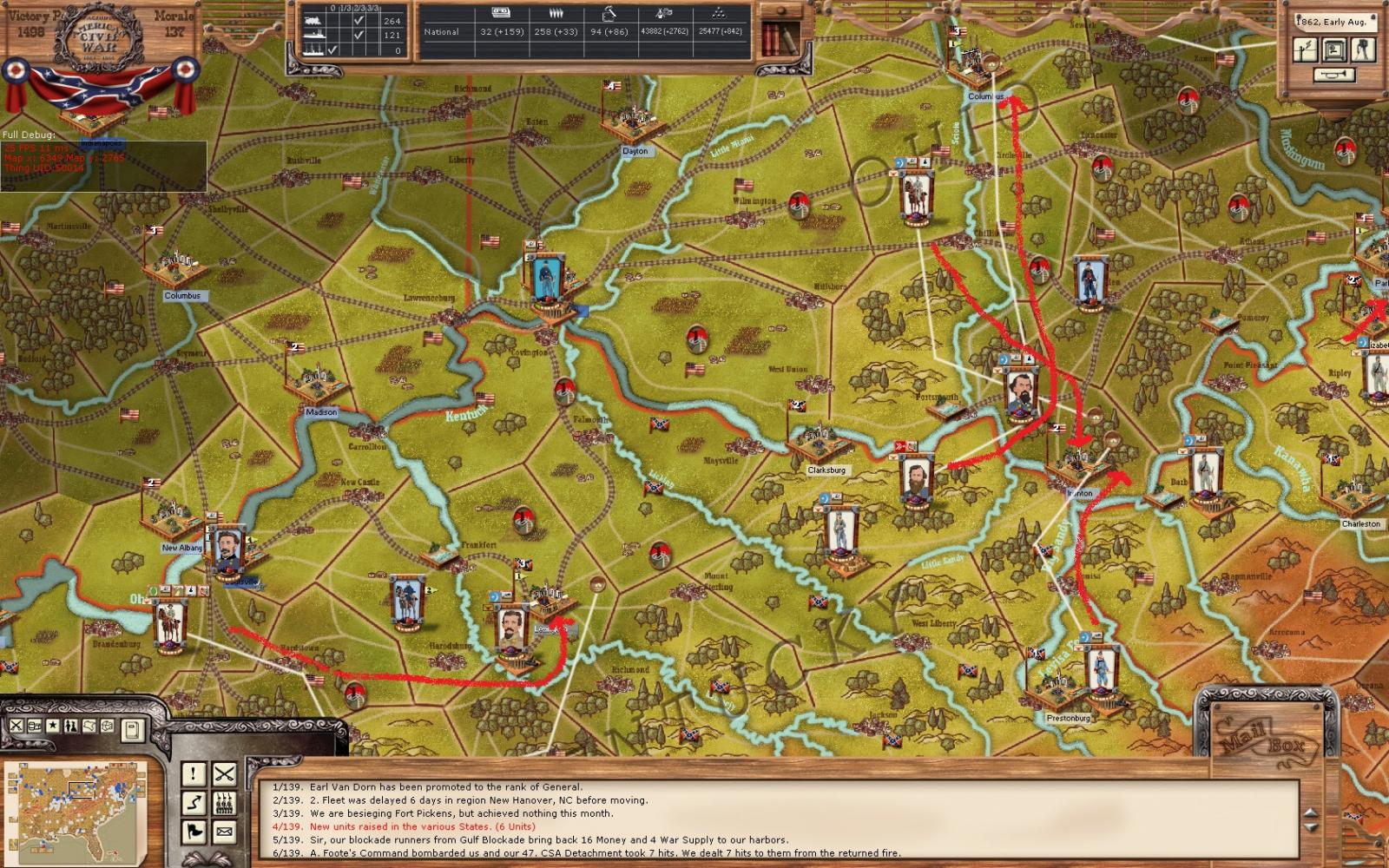 I'm not sure that Grant will be able to do much for now. He can advance through Humboldt, my center, but he can't ignore my forces on both of his flanks. I still have a fleet that can at least challenge his, plus forces entrenched on both sides of the MS river to provide bombardment. AJ is moving west to Forts Henry and Donnelson. Forney and Polk have now formed corps under the Army of TN. JJ will sit at Bowling Green with most likely only one division. Two partisan units will move North to cut rail. My cavalry will continue to keep the rail North of Bowling Green cut.