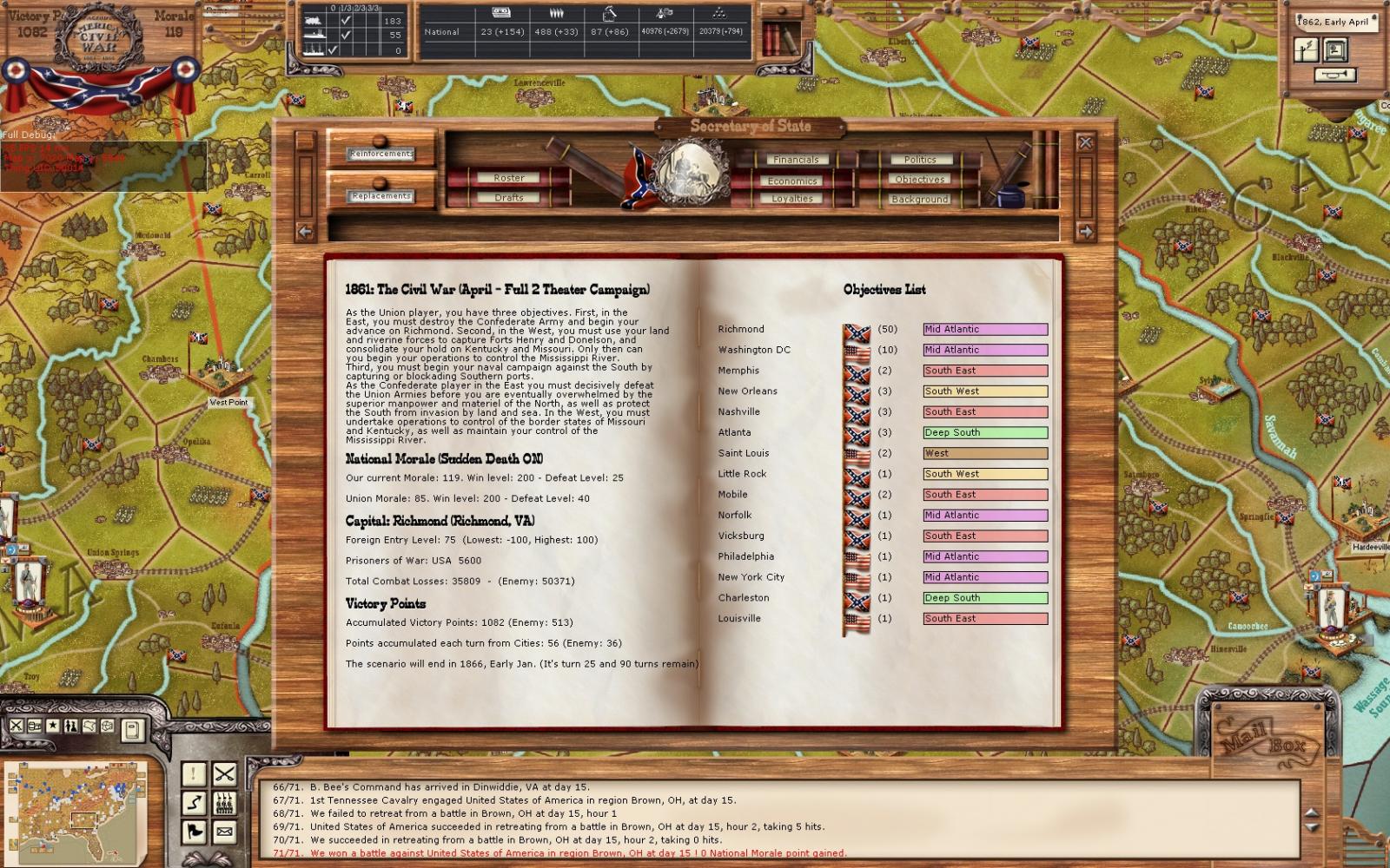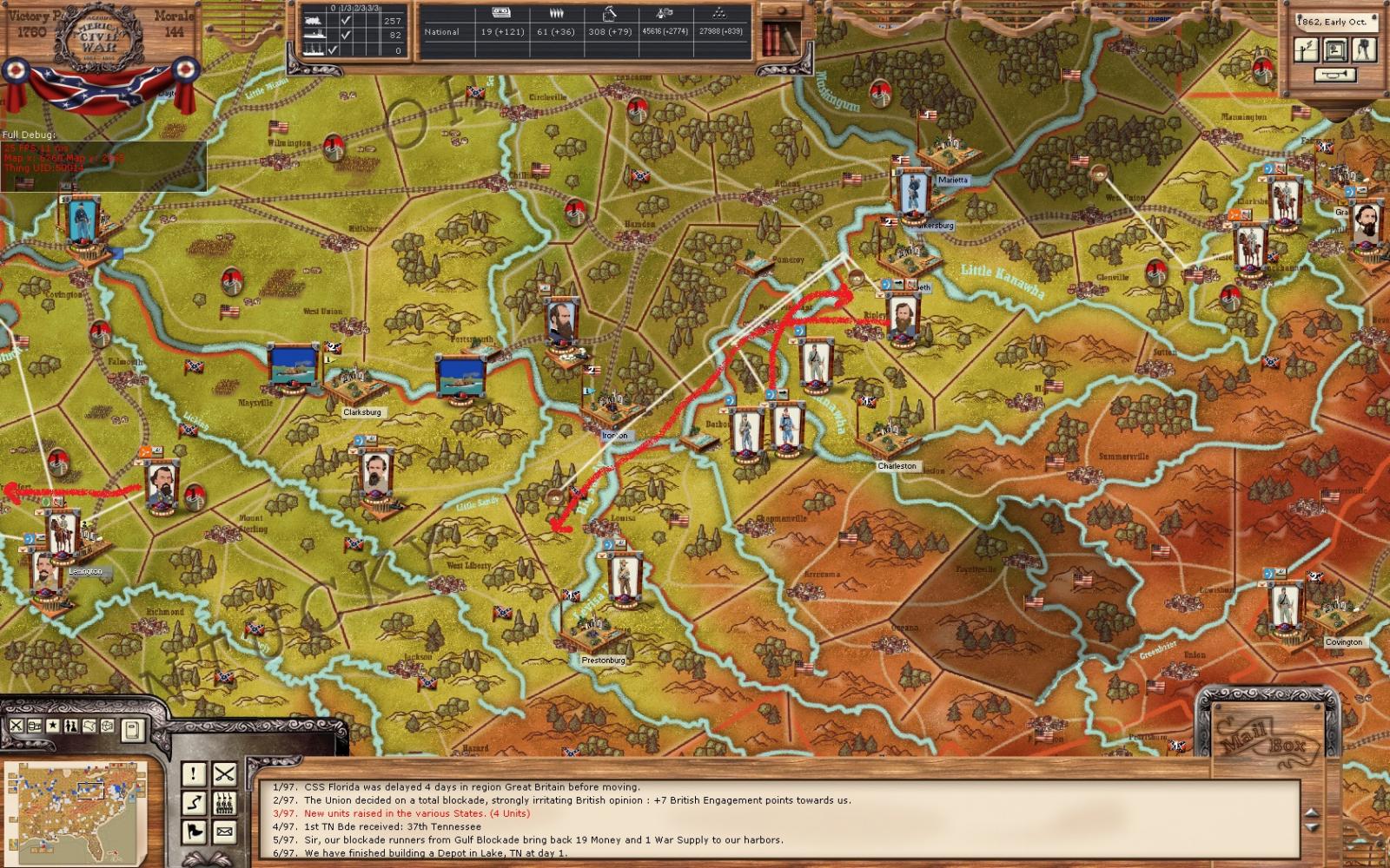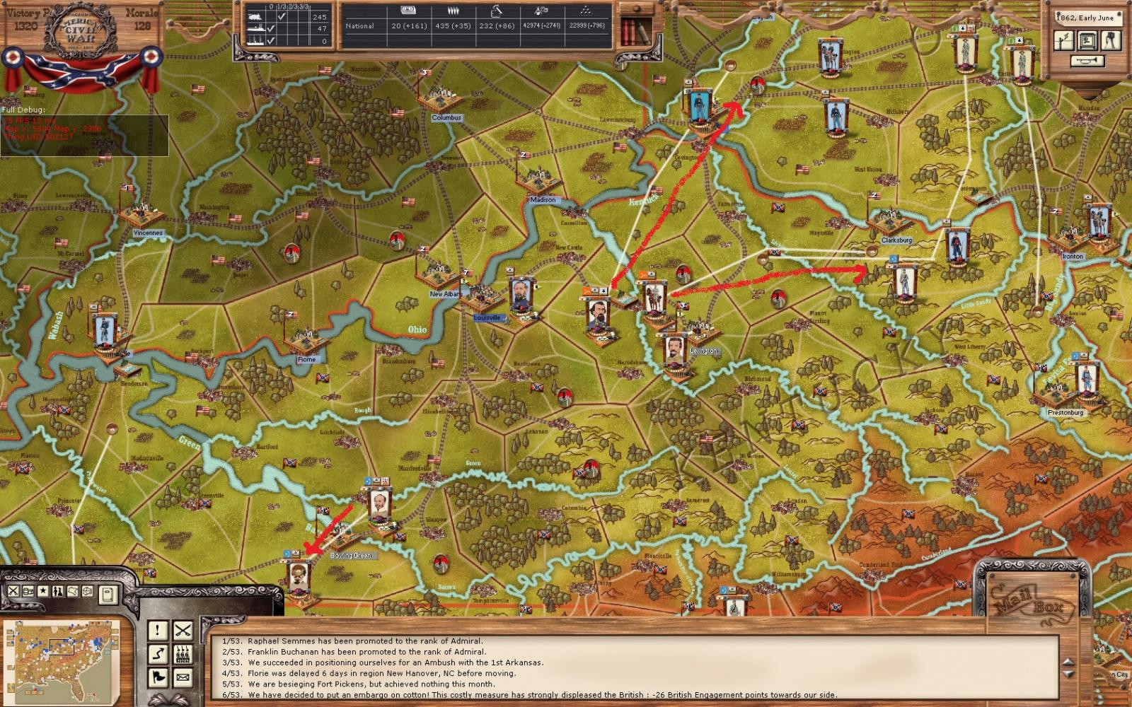 when can you go for Cotton embargo again ? If memory serves me right, the events about France not offering recognition and then invading mexico fire in early 62. You would need to get to 100 before that... I would love to see and MP game with the foreign intervention activated...