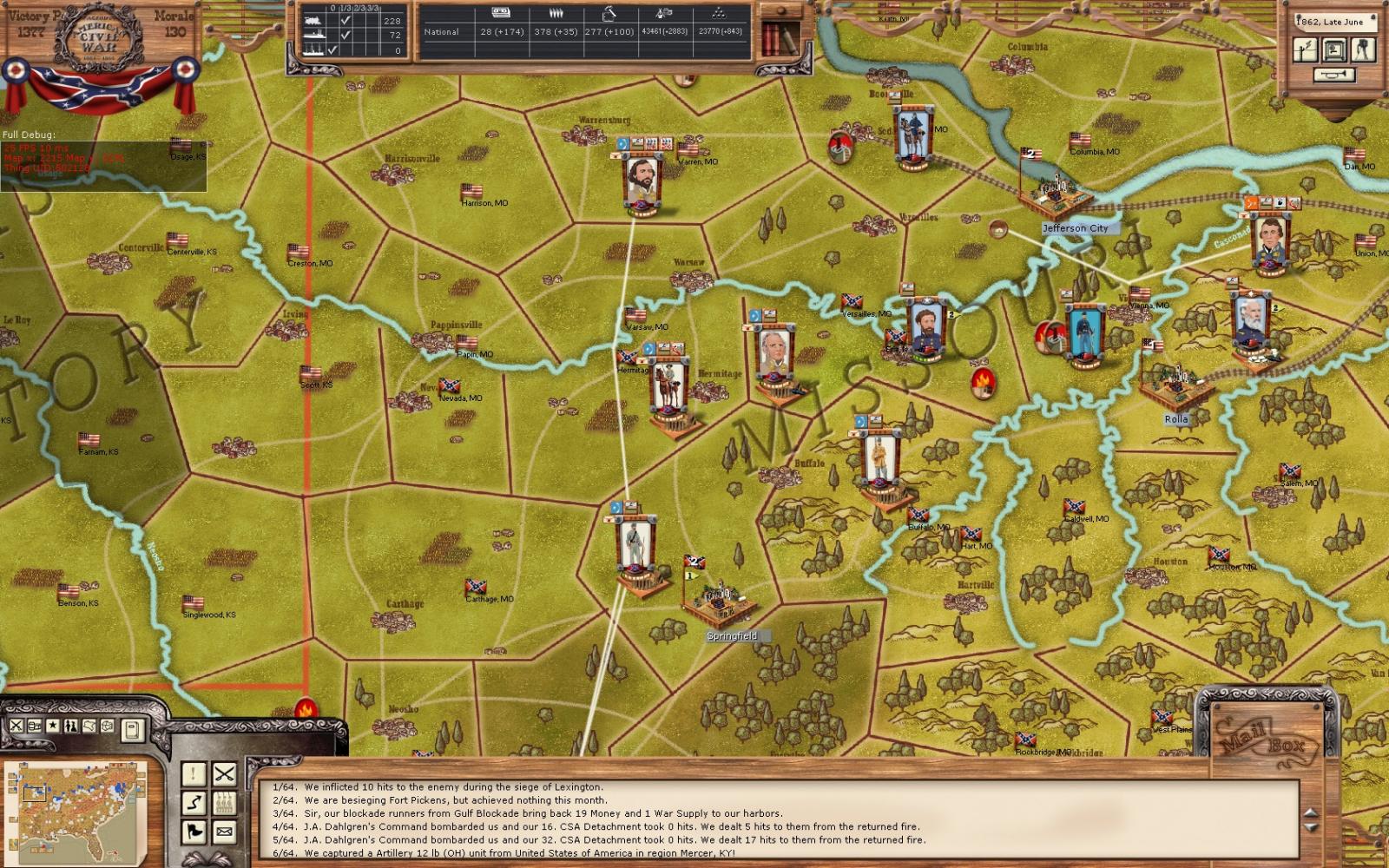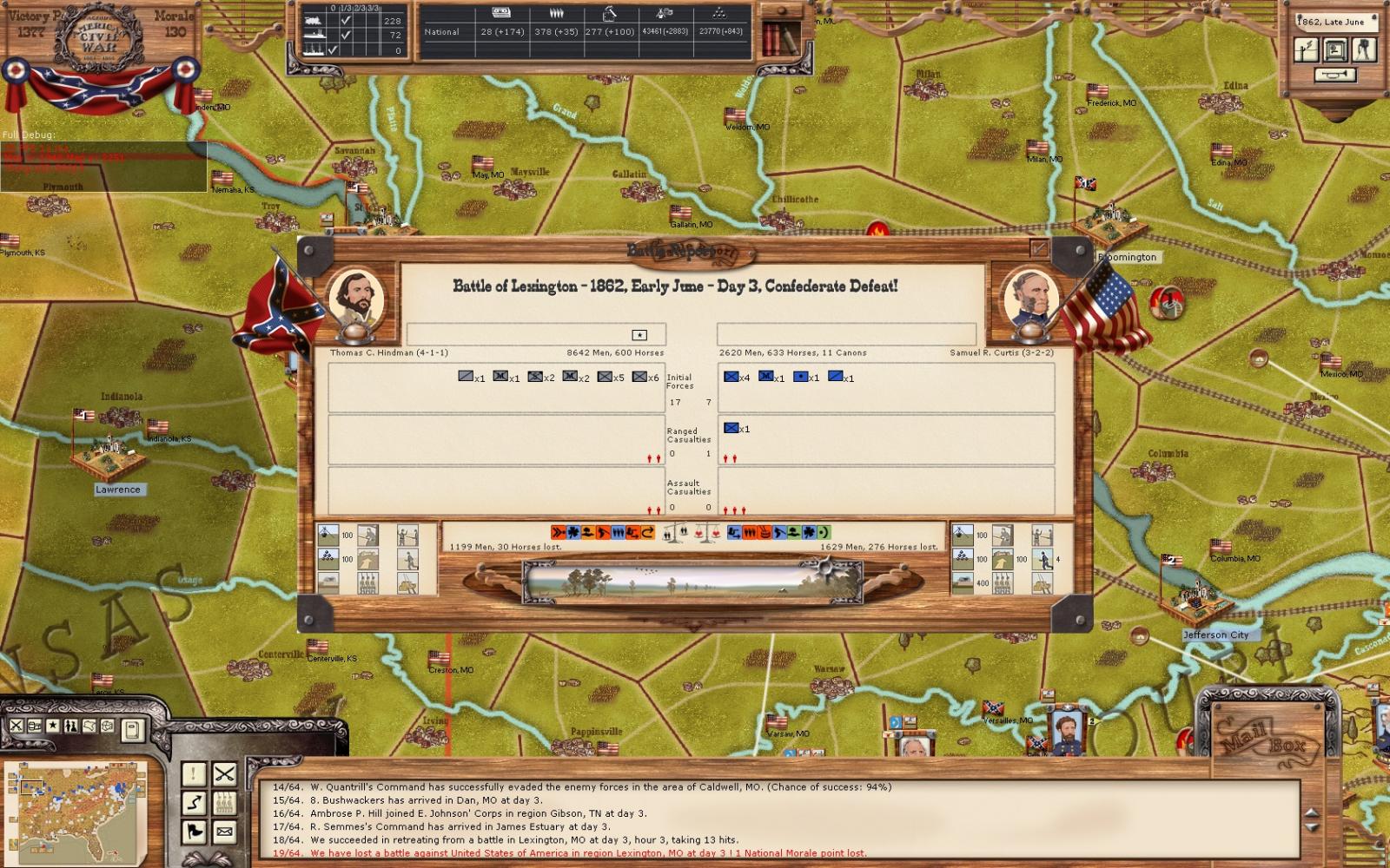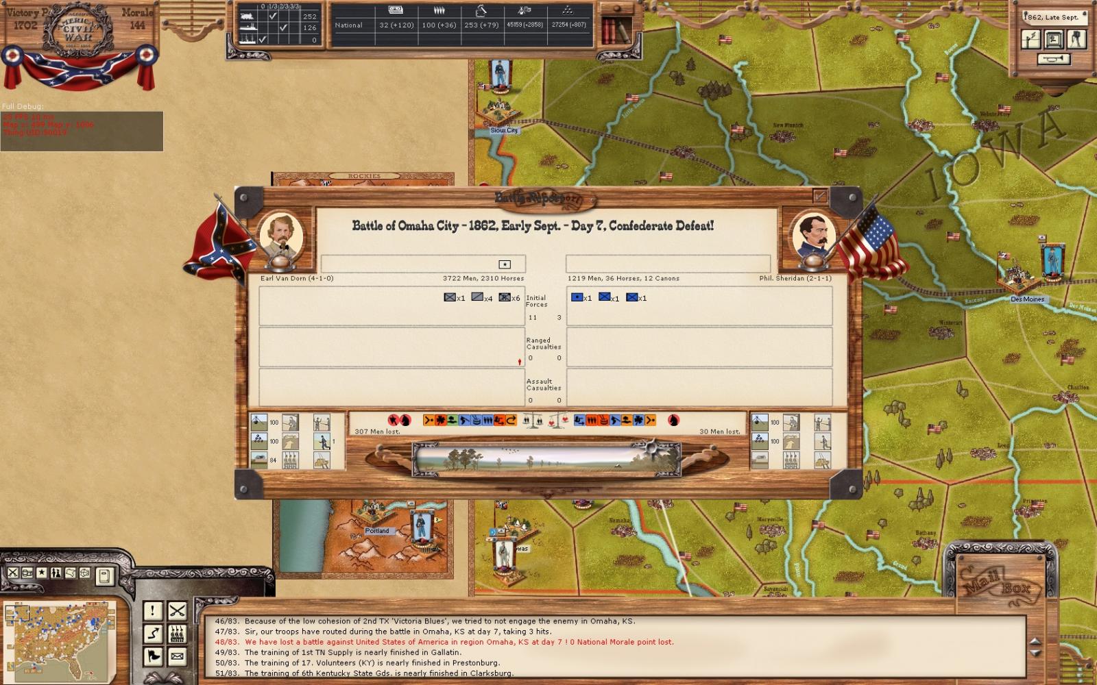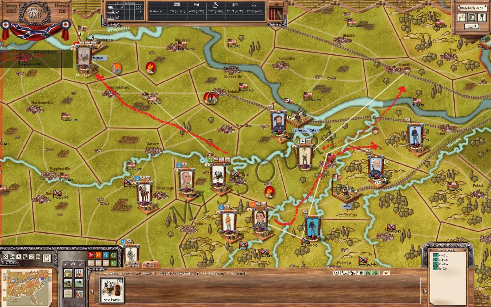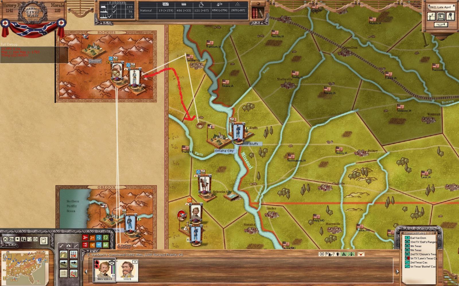Hindman is going to stay put for a turn. I may move him to take St. Josephs or to dig in at Fort Levenworth, depending on what the enemy units at Lexington do. The enemy forces in Omaha City I expect to just starve out. I think having the depot at Council Bluffs is a good position. Watie is moving to attack some enemy militia off map and get some more experiance for his little indians.