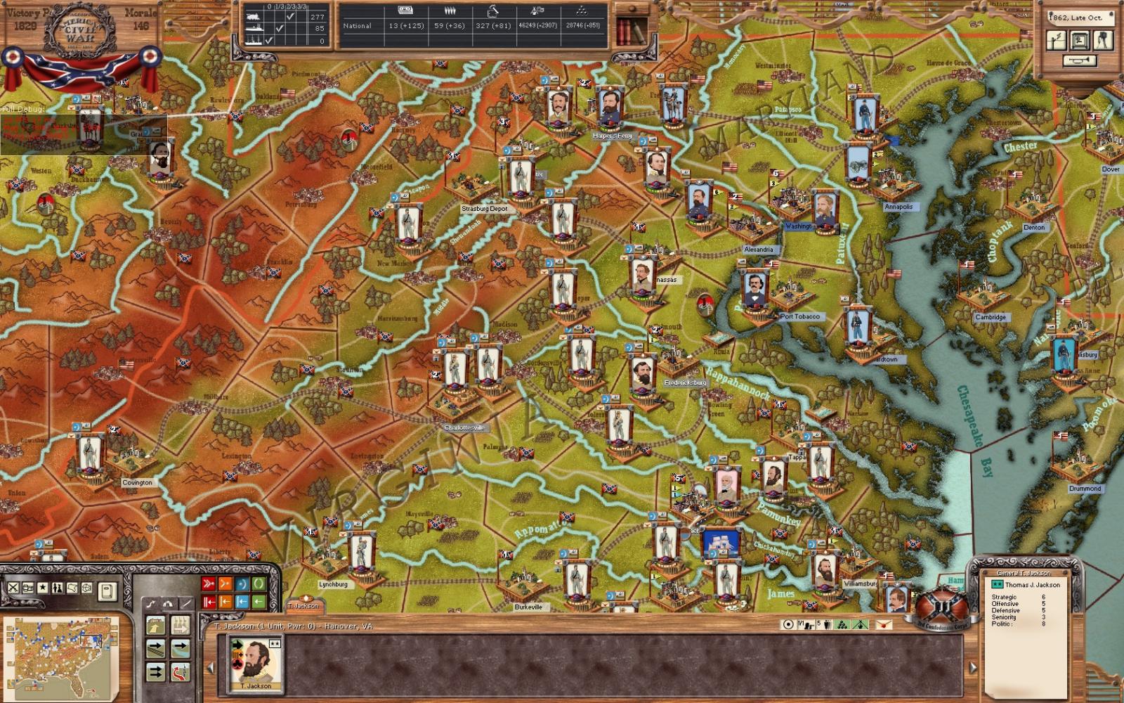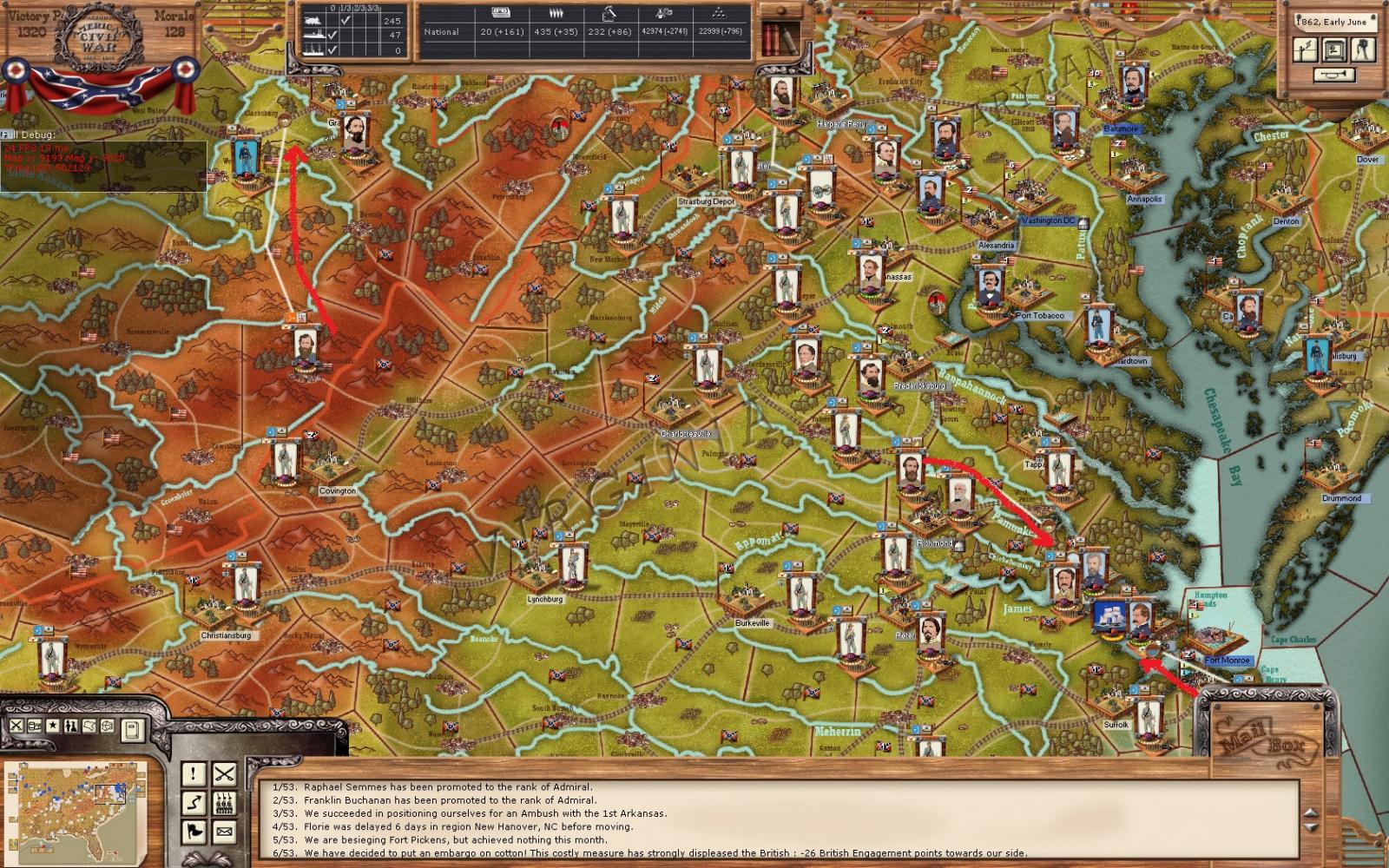 Longstreet is firmly in place at Williamsburg and the enemy will pay heavily attacking is position I'm thinking. Mcgruder has taken charge of a corps at Harpers Ferry anchoring the end of my line there. Other than that not much going on here. Thinking of trying to challenge his fleet, but then I really need to get Semmes or Buchanan there before doing it. Other than that I'll try to get some more artillery at that small port North of Petersburg so that his ships will take even more hits.