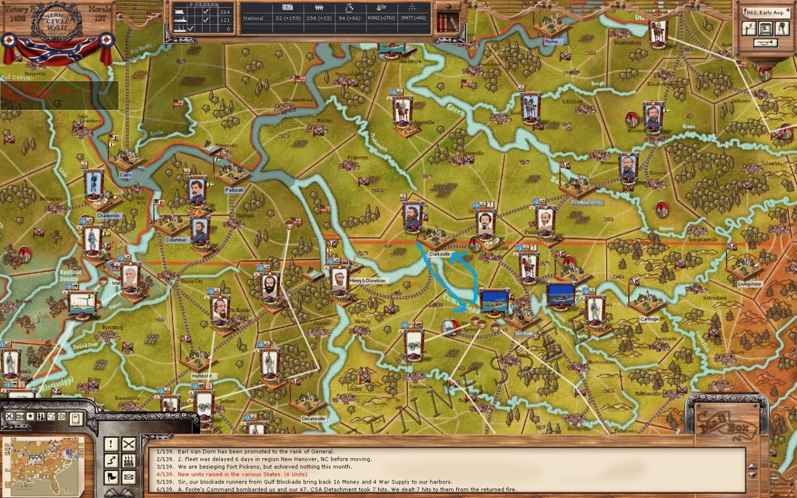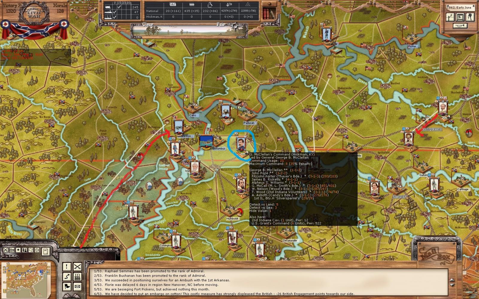 I'm not sure that Grant will be able to do much for now. He can advance through Humboldt, my center, but he can't ignore my forces on both of his flanks. I still have a fleet that can at least challenge his, plus forces entrenched on both sides of the MS river to provide bombardment. AJ is moving west to Forts Henry and Donnelson. Forney and Polk have now formed corps under the Army of TN. JJ will sit at Bowling Green with most likely only one division. Two partisan units will move North to cut rail. My cavalry will continue to keep the rail North of Bowling Green cut.