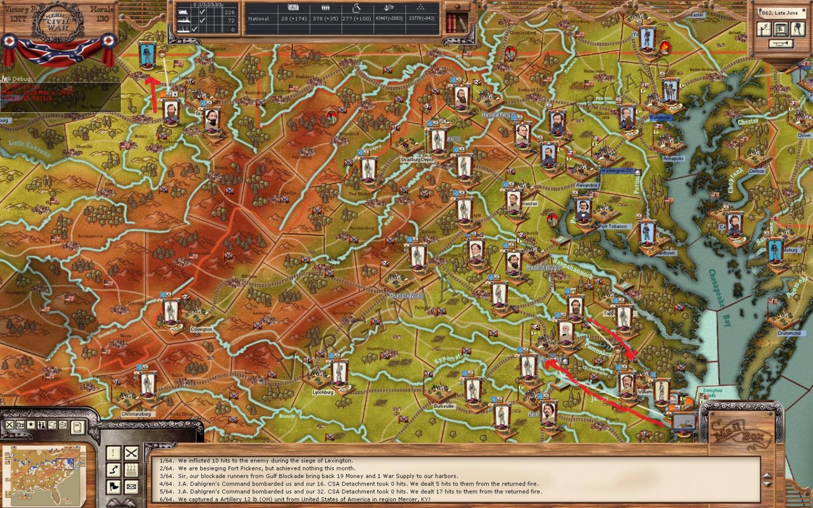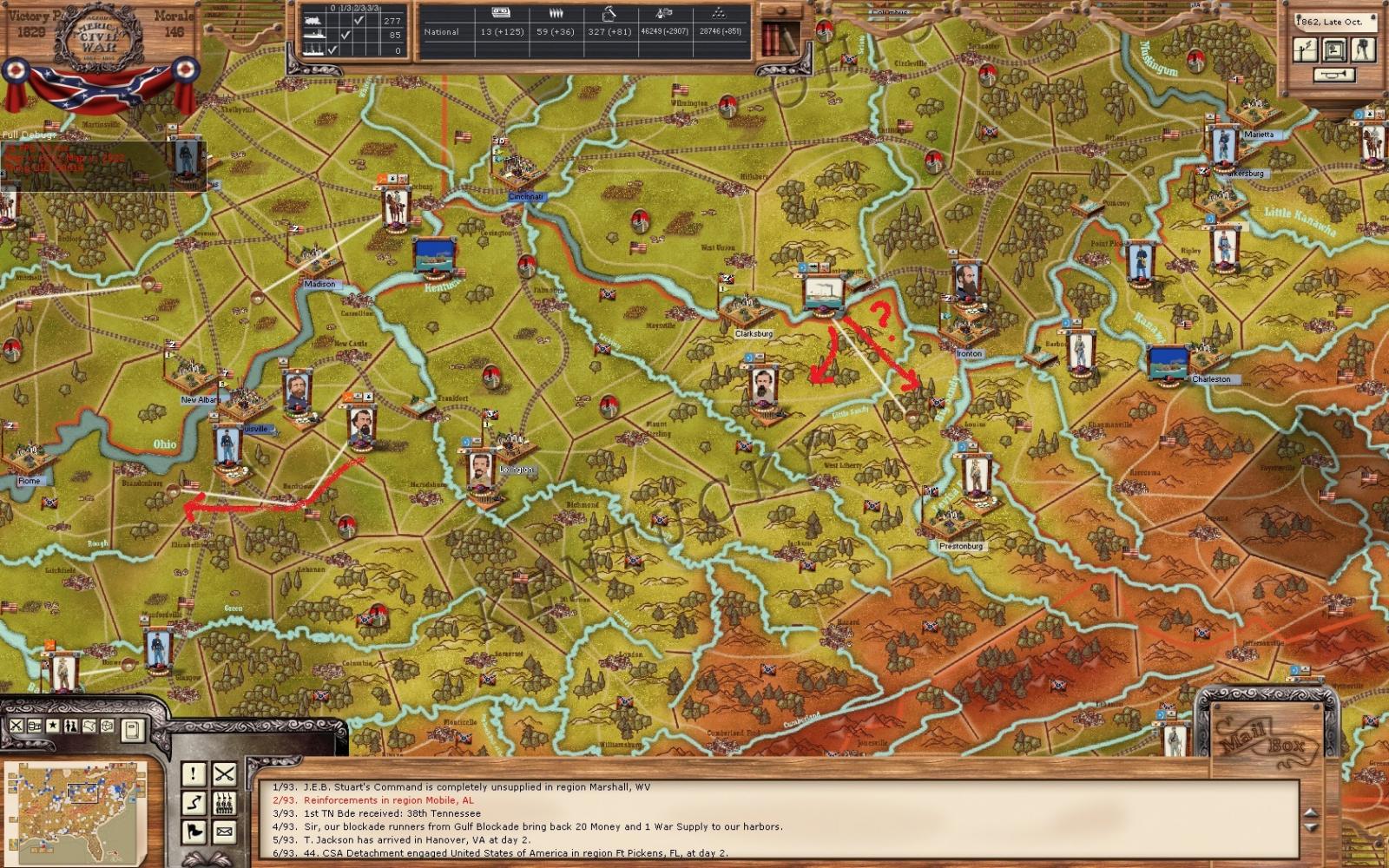 One thing you might notice is that I'll leave weak points in the line for the enemy to advance. I'm sure he will scout my lines and go which way is easiest. If I were to try to form solid lines that have no weak points and wait for him to move he as the North could just assemblie overwhelming manpower and hit me with forces I could not turn back. If the CSA player sits back and its just reacting then the North by 1863-64 will have enough resources to overwhelm single points in the line with basically heavy losses that the CSA can not keep pace with. 1862 will not be a slow year for sure. I'll be raising the maximum amount of partisans cutting rail everwhere I can. Additionally I hope to use points in KY and WV to threaten areas in Northern territory, as well as expand my grasp on the West.