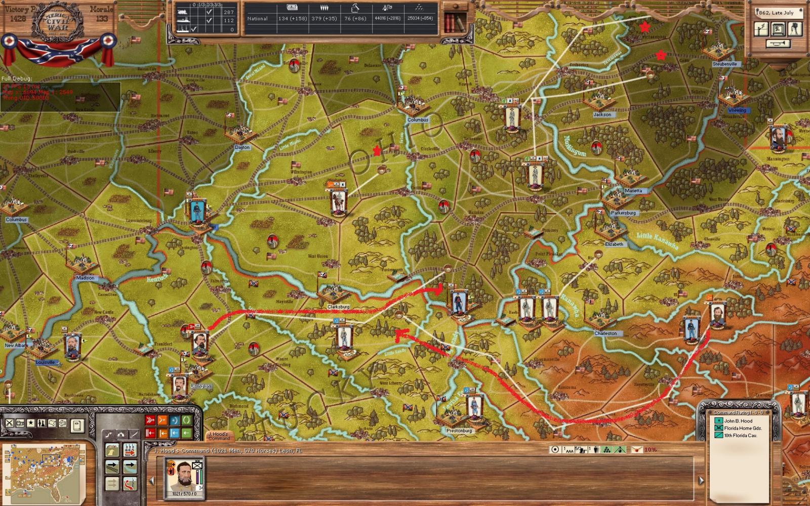 Forrest is good on supply so will move to cut the rail South of Louisville and try to destroy the enemy brigade there. Stuart is in a bad positions with supply. I may break his force up and move them in two different directions. I know some of the units starve, but when that happens for some reason the generals starve with them. Anyways, may move in different directions to maximize supply. Sending a small two infantry brigade to attack the enemy unit near Bowling Green.