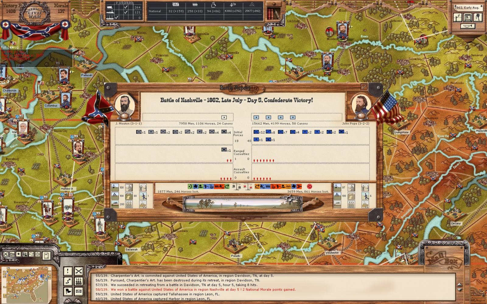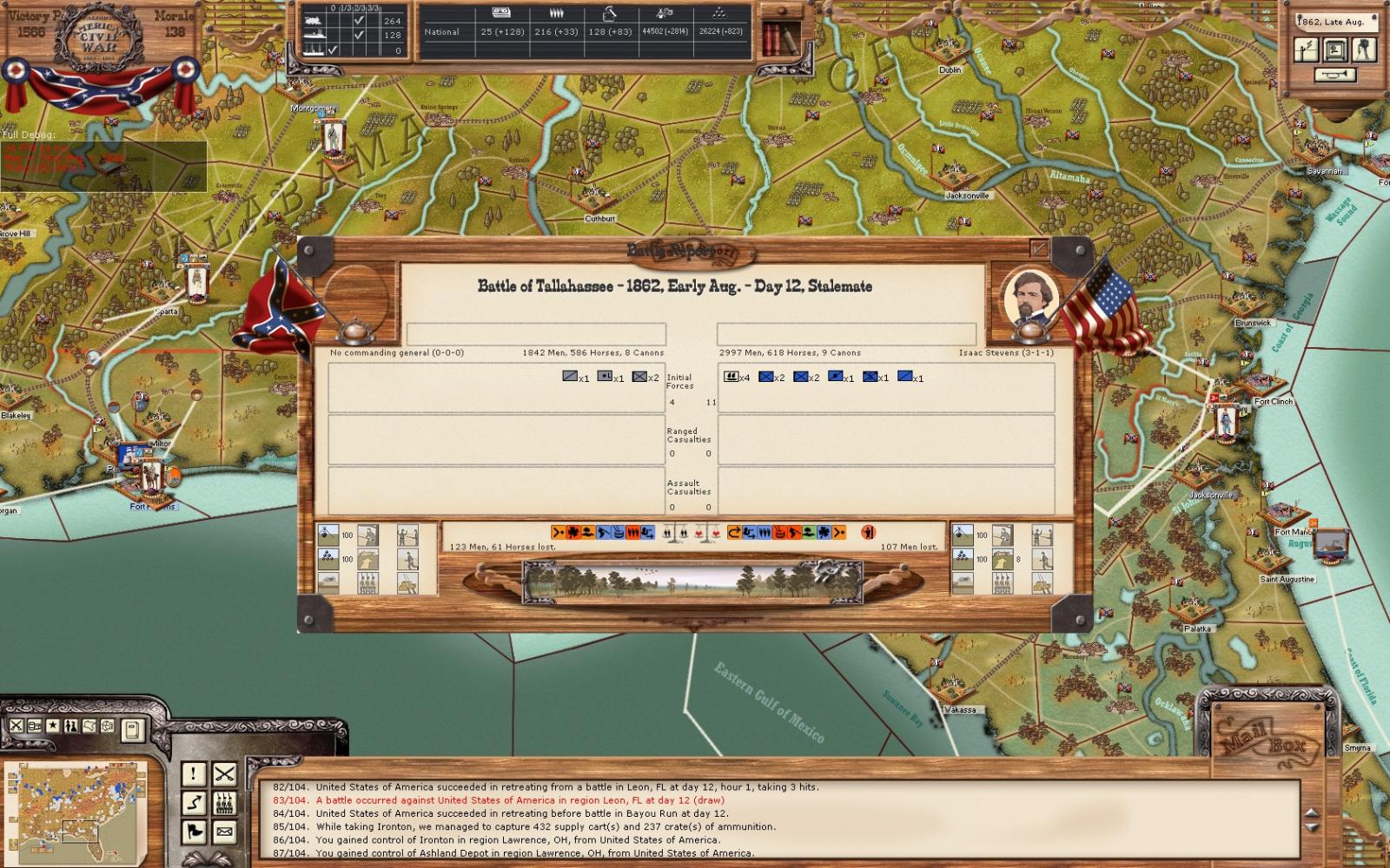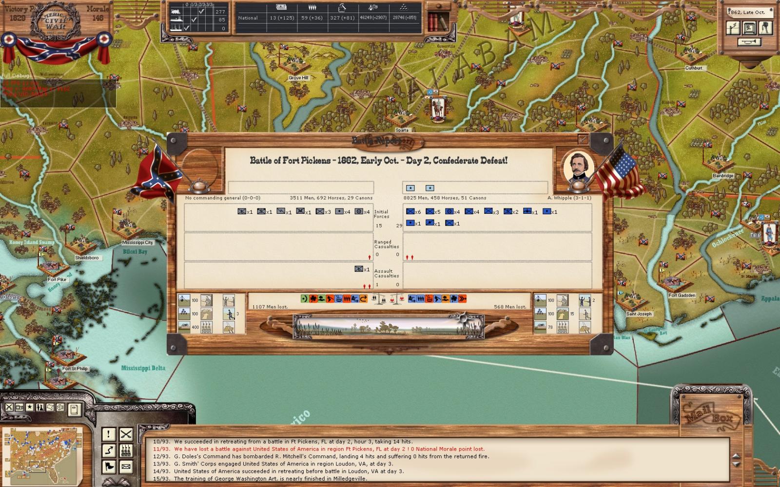 I know it says defeat, but I think I won that one. I managed to hold my ground outside of Fort Pickens and during the next three turns will have three divisions sieging the fort.