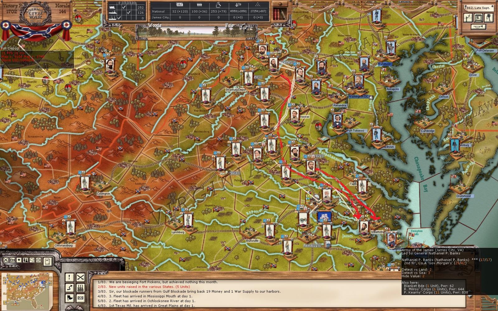 The enemy force at Alexandria has a power of about 800. Not sure if that is enough to make any kind of concentrated attack South. Enemy cavalry appears to be scouting Fredricksburg. Walker will be moving up to Fredricksburg with a full division. I'm sure my opponent can not see Walker or my forces at Richmond. Smith will for sure move on Leesburg for the terrain and MTSG advantage there. He will be joined by a full division led by General Alexander. Jackson will stay put for the moment as will Mcgruder. I have artillery moving towards Williamsburg to build that fort. By 1863 Richmond is going to be surrounded by a ring of steel. He can't bypass the forts easily and I'll be working within my interior lines so I think I'm in a good position. If he were for force me from Northern Virginia then I can not use the terrain to as good an advantage so best to contain the fighting there. Hence the investment in forts.