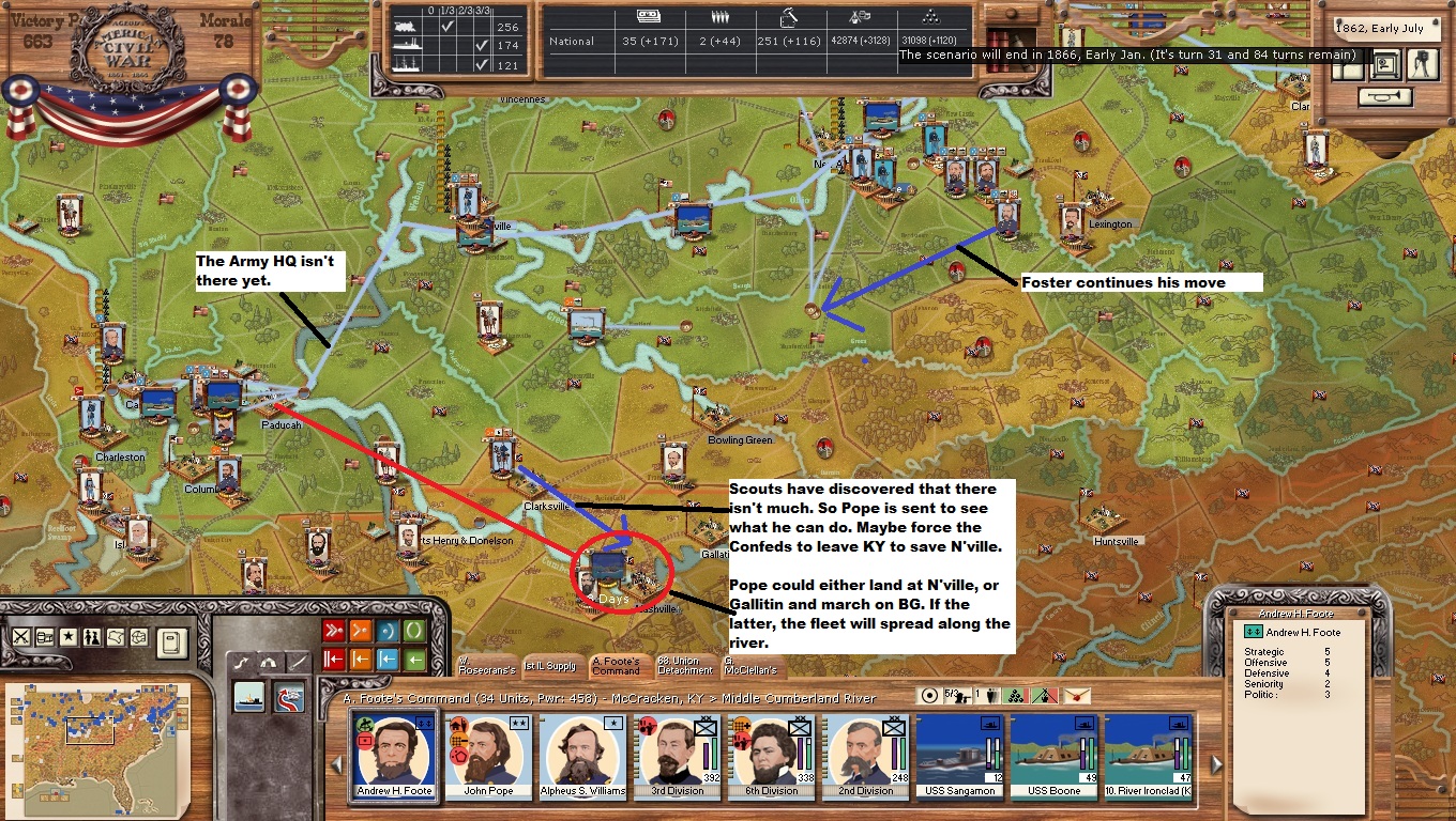 By thrusting at Nashville, I'm hoping for one of two things. Weaken the line in front of Grant. Or pull out of Kentucky. The force in Lexington can't go north very far with the river blocked. And if Nashville falls, they won't be going very far south either once the river is blocked.