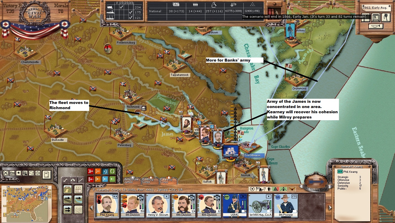 At least in my view. See, in one of our games, I lost Pittsburg, Cincy, and a couple of others. Does anyone really think that Northern papers would be howling about Richmond when Confederate armies are on their way to New York City?