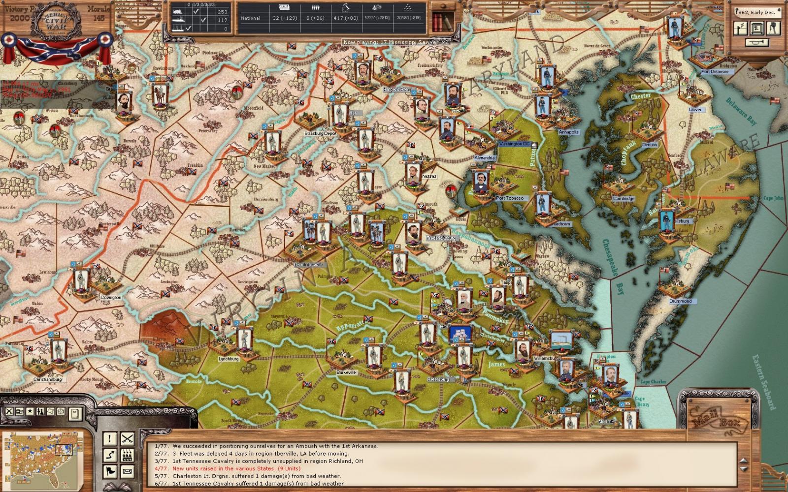 regarding your attack on Cairo, don't you fear that this will risk getting some of your forces stranded on the north side of the river if his boats prevent you from crossing back ? In that case you will lose troops in the same way he lost some... I would put the priority on stabilising that front and then either try to push him back accross the Ohio in Kentucky or Go for a big gambit an try to take St Louis an break his back in the transmississippi theater.. Anyway things are going really great...