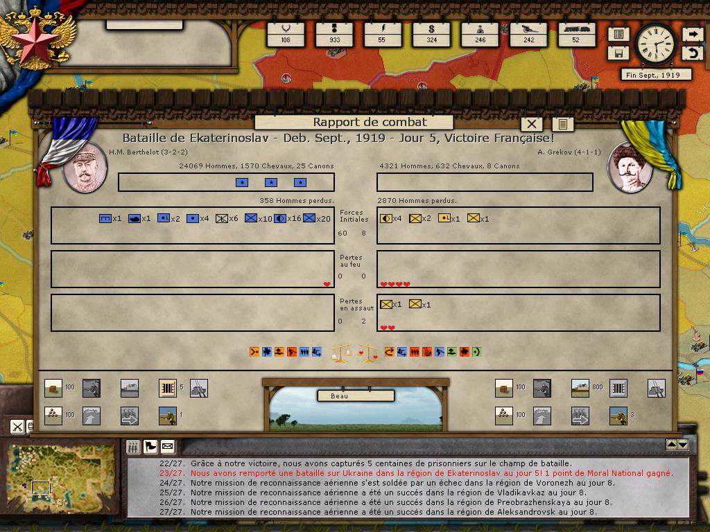 En Ukraine, l'Armée d'Orient avancent au rythme d'une tortue le long du Dniepr. Les mutineries paralysent les mouvements et empêchent les deux corps d'agir de concert. Au mois de septembre, Berthelot attaque Ekaterinoslav sur la rive droite du fleuve et bat une armée ukrainienne. La route de Kiev est ouverte mais la faible fiabilité des troupes alliées rend peu probable une avancée aussi loin. L'offensive franco-grecque aura au moins eu le mérite de renforcer le flanc ouest des Blancs du Sud [je viens de m'apercevoir que le port d'Odessa est un objectif important, ça aurait été plus rentable de débarquer directement là bas].