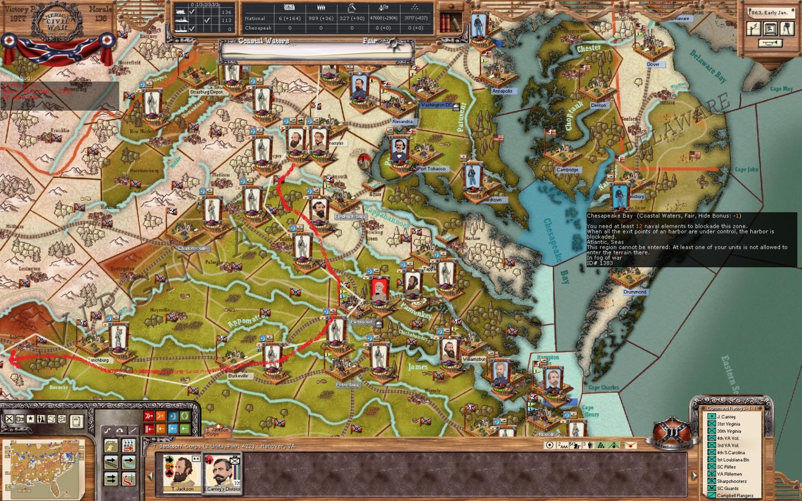 This western Kentucky campaign is the highlight of the war so far. Funny how Virginia is a peripheral theater in this game. It is a mistake from him not to put pressure on you there, as it allows you to have enough forces in the west were there is more territory to cover and he should be able to ountmanouver you, as well as in the gulf where you have been able to react to his invasions.. Had you been under sustained assault in Virginia you would have 4 or 5 divs more overthere rather than available somewhere else...