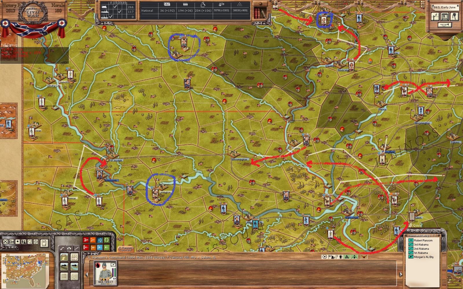 The depot in Iowa should fall this turn and Van Dorn will have all the supply he needs. Hindman holds his position and I know that the enemy forces West of him are going to be out of supply. I'm sending a 3 element brigade to take St. Josephs, MO. Other than that just a lot of raiding.