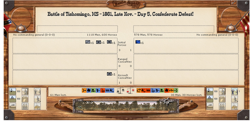 The Confederates have recaptured Covington, and checked Lyon’s advance towards Memphis. Foote’s smaller squadron engaged the Confederate Mississippi Fleet on day six in the Obion Confluent, but retreated before battle back to Island 10. Amazingly the Union Fleet coming from Cairo Illinois did not engage either. It actually arrived in the water region south of the Confederate fleet on day four. There is no reference to the fleets criss-crossing and they should’ve engaged as the Confederates were in offensive mode. Although there are no game explanations, we’ll explain it away by saying one of the sides went down a tributary or some side canal. Regardless, despite their size, they did not encounter one another.