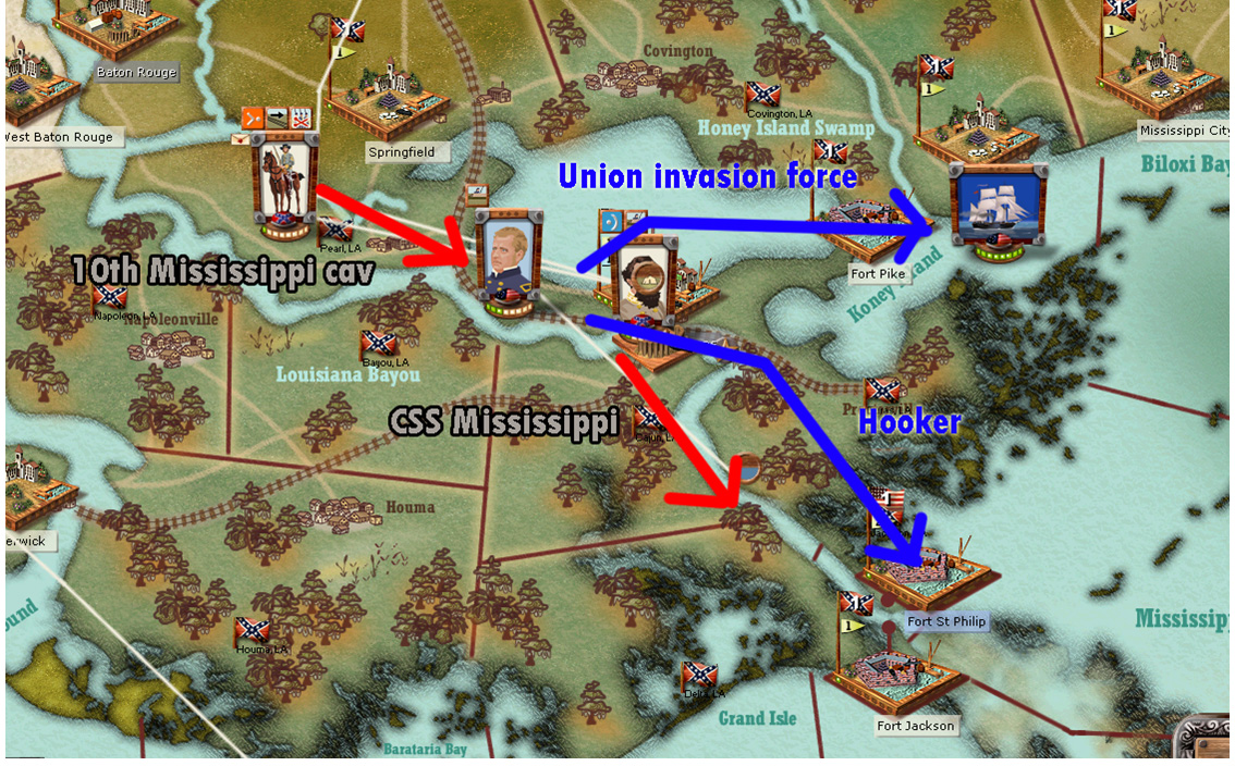 Turn 17 Results- Due to John’s defensive stance at New Orleans, Federal forces have managed to evade interception. However, Blenker’s force remains in Iberville region as the turn ends with one day left to finish the boarding of the ships.