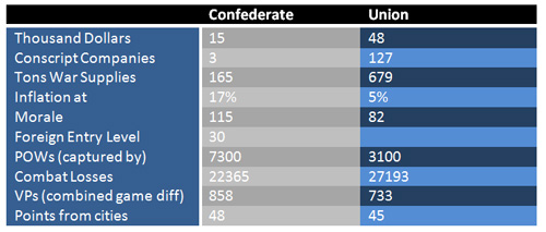 There were several engagements at sea. John’s Harriet lane squadron was hit eight times while returning one hit to one of Manstein’s Atlantic squadrons. Manstein’s Gulf squadron located John’s Lewis Cass squadron inflicting four hits with one returned. Palmer found Semmes and hits went 1 to 3. John’s merchant raiders sink 16 money and two war supply. His blockade runners return eight money and one war supply. Manstein’s merchant marine returns 20 money and two war supply.