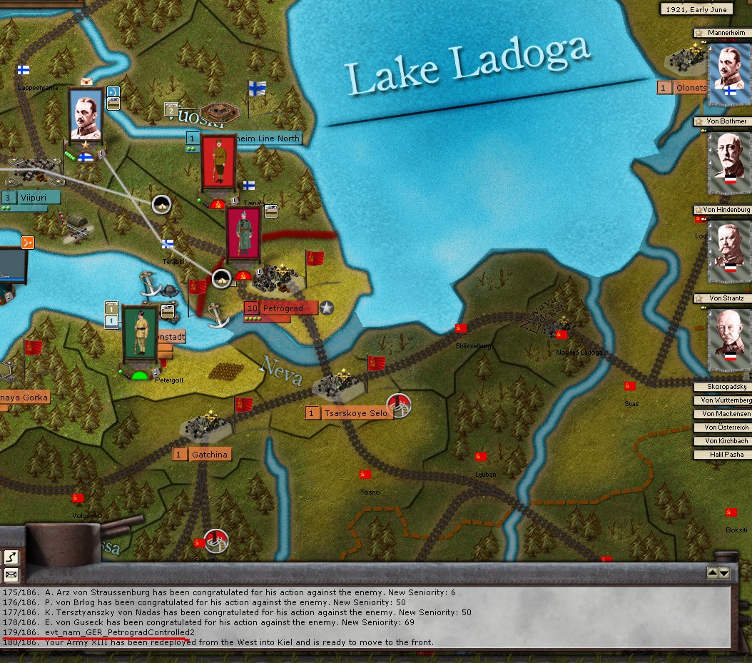 4) The event evt_nam_GER_PetrogradControlled2 seems completly screwed up. It fired multiple times. The first time as you can see in the pic before I actually had any troops in Petrograd.