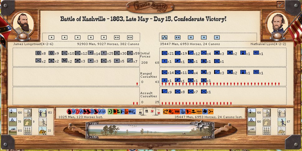Playing as the Confederates I was quite amused when my Indians rose up to take Fort Laramie only to find that it was defended by, you guessed it, the U.S. Cavalry. All 30,000 of them!