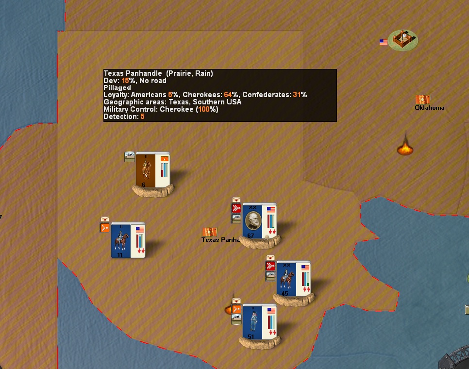 In this region I have several units, but I can't play any Colonial cards or charge the MC from 0%. I need to make some inroad so I am able to play the Colonial Protectorate card on the Cherokee capital. Now I think I understand what I'm doing, to do this u must have at least 50% CP in the capital and an average 30% average with the rest of the regions. MC isn't a factor is that correct? If I'm right the only thing that bothers me is Panhandle, not being able to do anything there. If I can sort this little issue I think will in my opinion have a good handle on understanding game finally