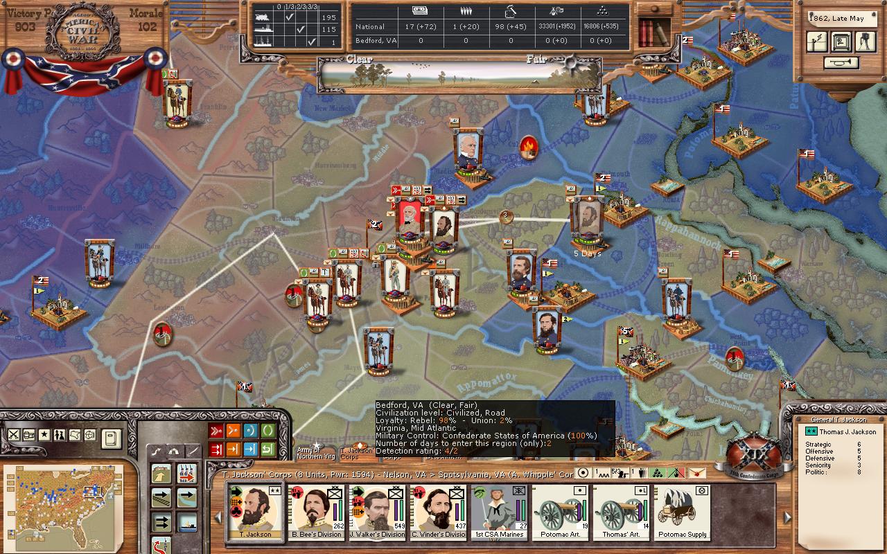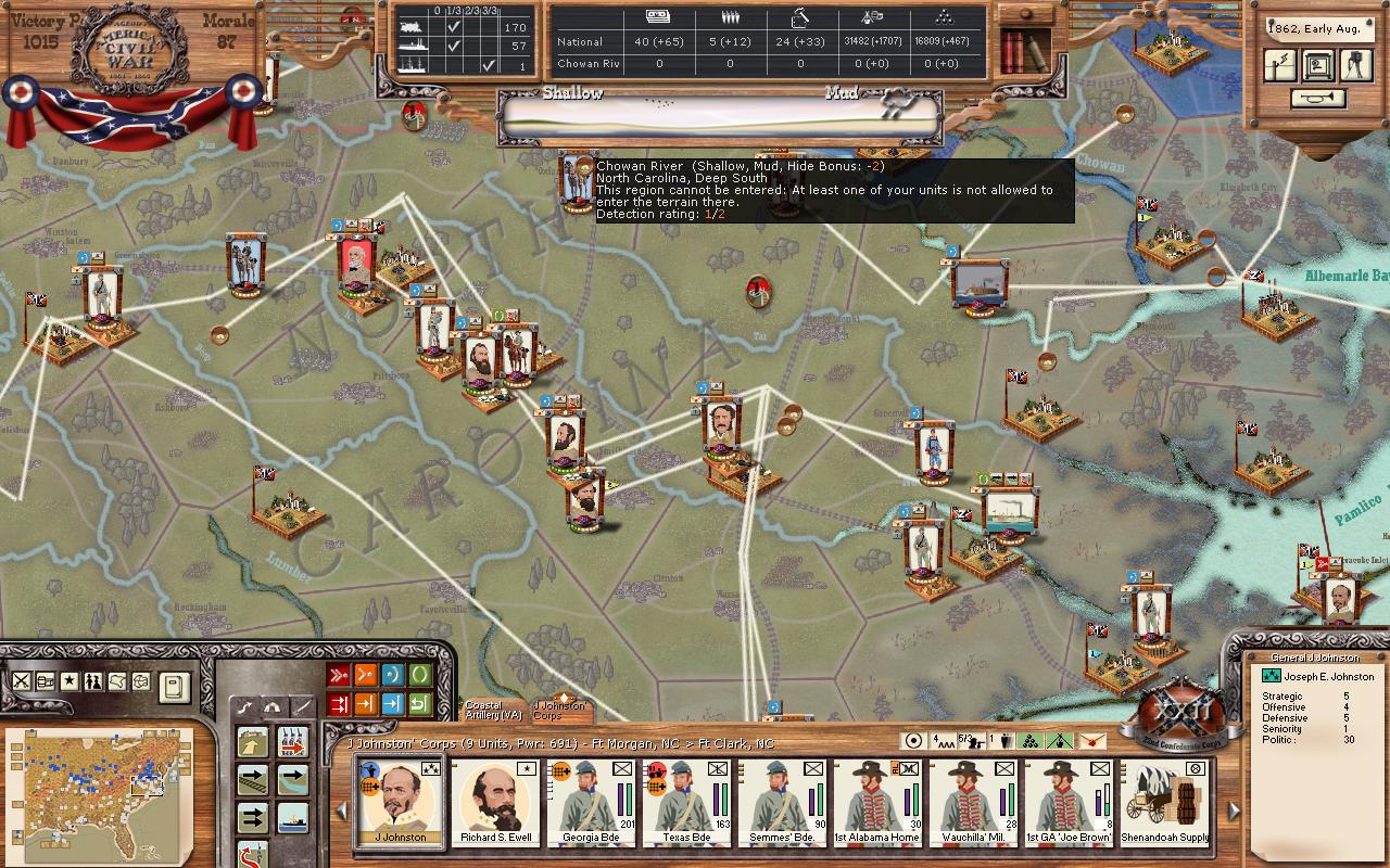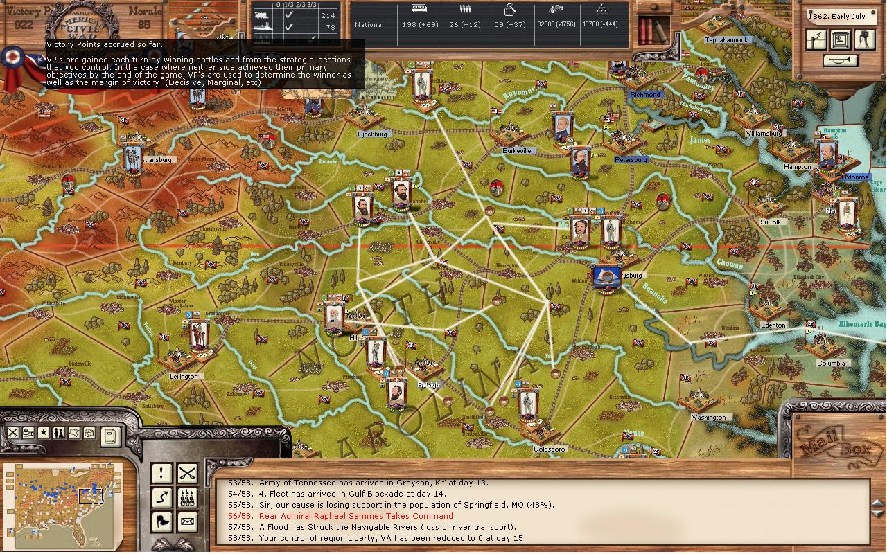 This is how you learn to play better, and I bet you've learned a ton already. OAM will surely teach you, as he is a stern taskmaster! Longshanks wrote:I guess you see the handwriting on the wall. It will be hard to resist for many reasons that I see: 1) your NM is so low and so your cohesion is low too; 2) you're outnumbered by cannons in every fight; 3) you lack support troops like hospital and signal in nearly all your stacks, while he doesn't; 4) all his victories have earned "stars" for his leaders and units, making them get better while yours get worse; 5) your supply situation is rough as you have noted - lack of SUs makes combat go badly - even VERY badly in later rounds of a fight because you lack ammo; 6) you've attacked several times across rivers but without Marines/sailors, etc to help you with the river crossing, thus incurring a stiff penalty. I'm sure there are more.