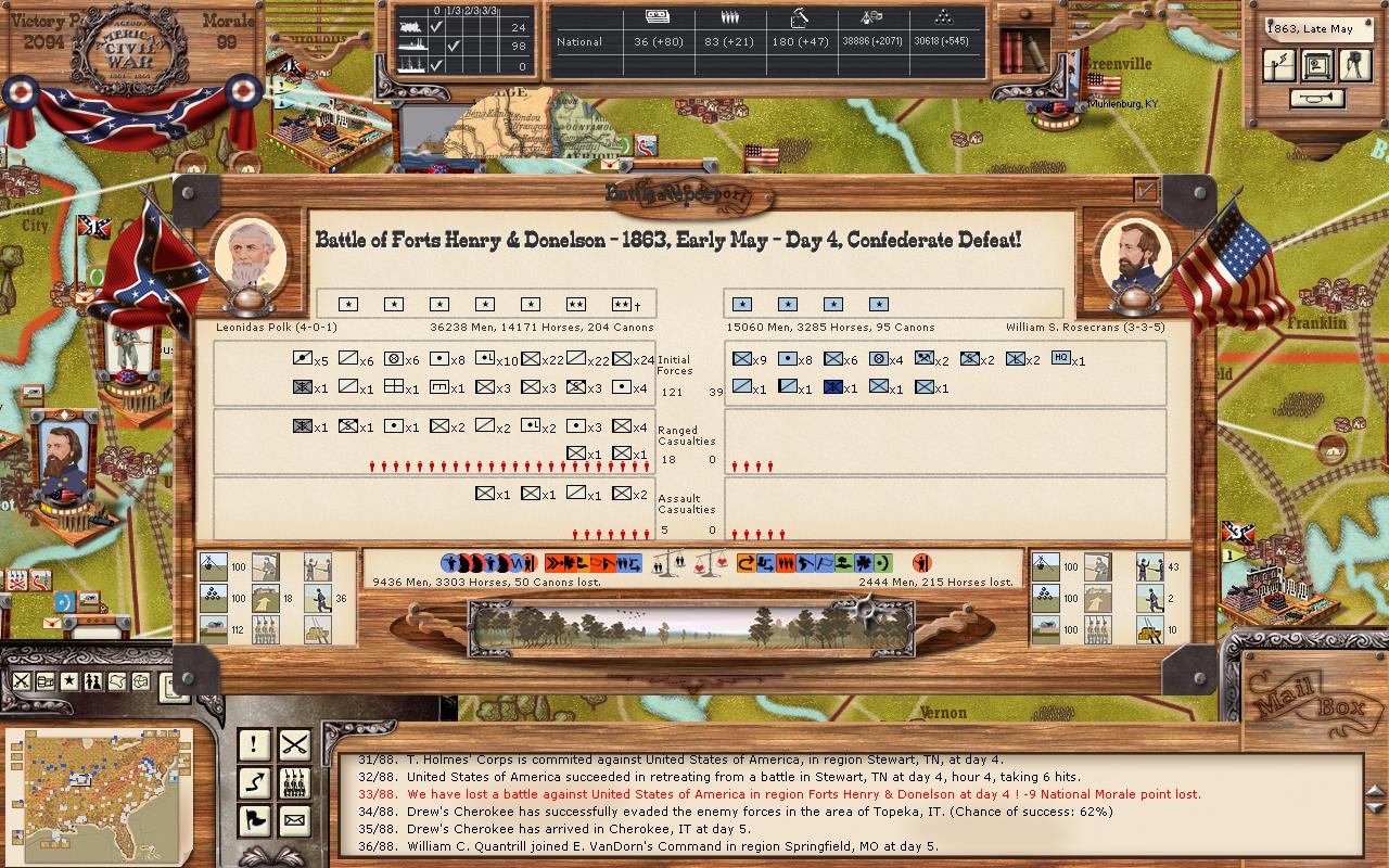 3. Forest terrain severely restricted your ability to use superior numbers due to frontage limitations. While Grant's superb stats allowed him to deploy the majority of is forces at once (see wiki http://www.ageod.net/aacwwiki/Frontage for additional details).