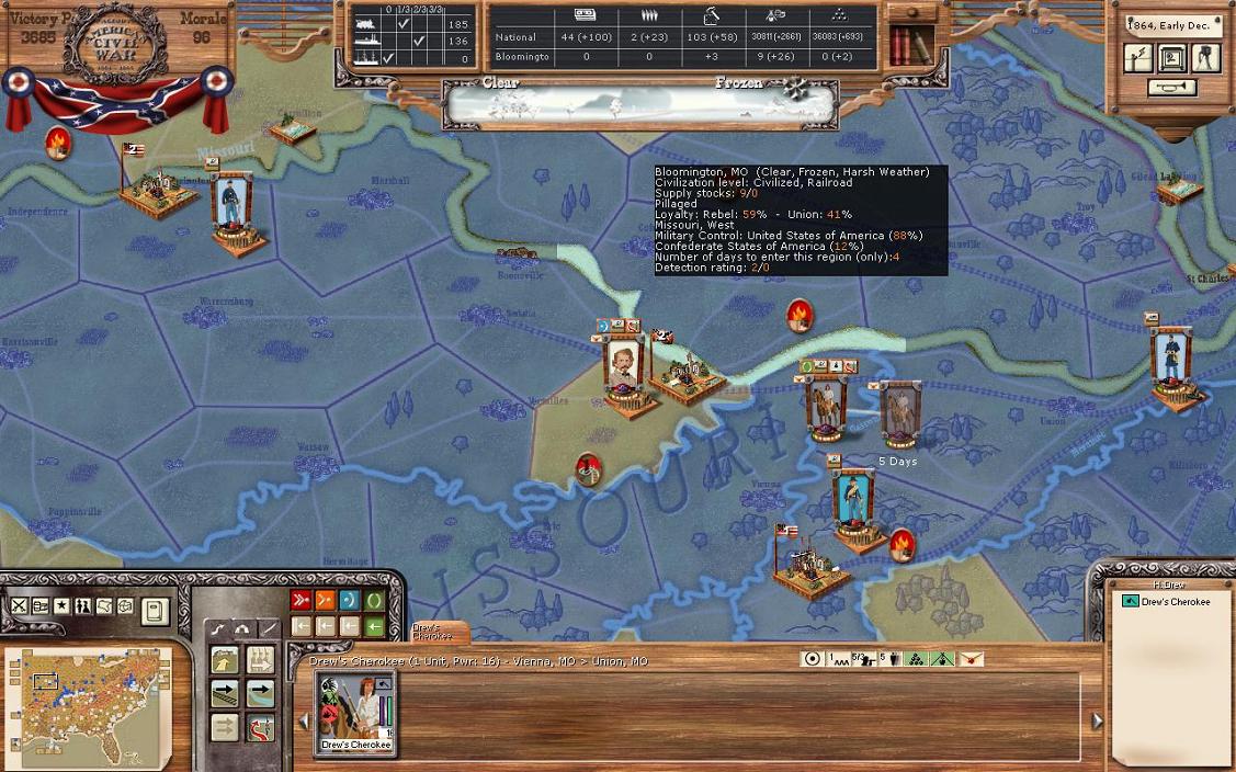 My partisan unit destroyed the RR in Mexico MO and took control of Bloomington on the way to Jefferson City. As the unit took control of the town passing through, it destroyed the supplies. Also note that Bloomington provides +3 WS, every little bit of WS counts. An Indian unit also moved to Vienne MO.