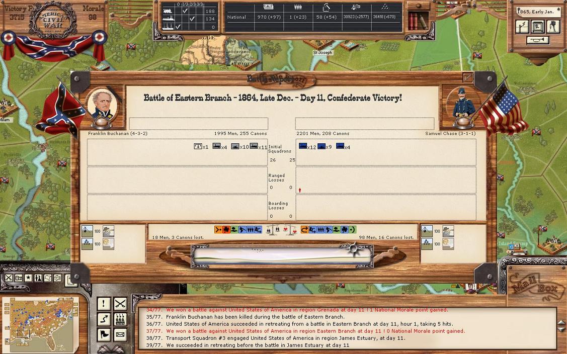 Next to Port Hudson there was a naval engagement on the mighty Mississippi River. This was a CSA victory; however, my Admiral was killed! Admiral Buchannan has been killed. Talk about an unlucky shot. This is a big loss as the CSA only had 2 admirals, and now there is 1. I really think it is unfair that the CSA has only 2 admirals. I believe there are 3 in the beginning, but then 1 sort of disappears as part of the game (presumed taken out of the game based on history). The battle screen doesn’t show him as killed, but the message box does and he certainly isn’t in the fleet anymore. The Union fleet now has power of 250. I’m going to target the Union fleet with my New Orleans fleet (power 315) and leave the Mississippi fleet where it is (power 416). Both fleets are on conservative attack. I hope that the Mississippi fleet will attack first and by then the New Orleans fleet can come in and hit the Union fleet again. Gordon’s division will also go to Baton Rouge to retake the city. Okay, I’m sending a cavalry unit that was created in NO to react to a raid and the NO supply unit to Waite in Grenada. I’m also sending General Zollicoffer with a now unlocked NO militia unit and a depleted fort battery to Jackson. I want the force in Jackson to start digging in beyond level 4 and artillery is needed for that.