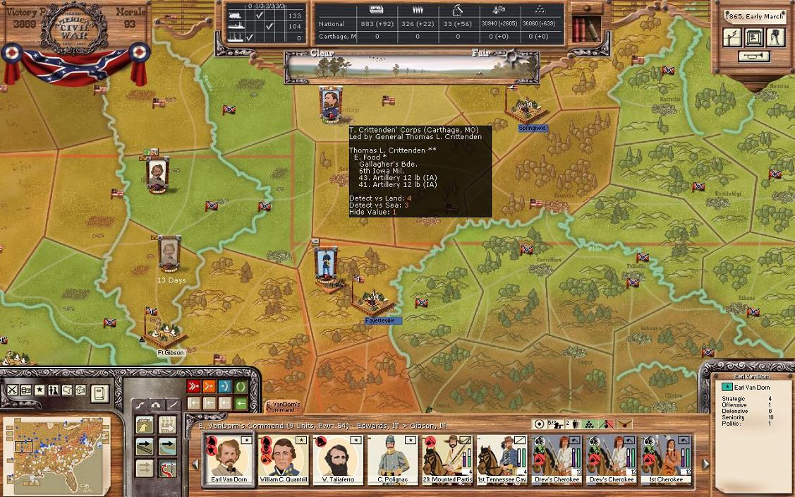Van Dorn is on now only 13 days away from Ft. Smith. Crittendon’s Corps has actually been chasing him, but is a couple regions behind. As Van Dorn only has enough full supply for 1 more turn, this is quite lucky. His force can resupply in Ft Smith before moving on.