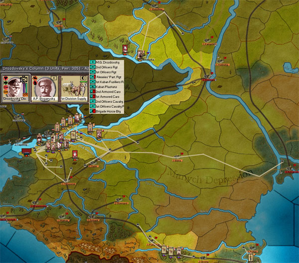 Drozdovsky's Corps is a dream come true for manoeuvre warfare enthusiasts such as myself. Shkuro's division gives you an idea of its force composition: elite and light infantry; elite cavalry and cav-arty supported by armored cars; other than supplies and eventually a transmission company, all units' speed coefficients are 110 or above. Prokovsky's division is similar, but is composed mostly of Cossacks and the bulk of our elite infantry. Shkuro may be detached as necessary for an additional fast-moving force during operational manoeuvres. I hope to use them for strategic offensives (encirclement/manoeuvre de derriere) and have them fight on the tactical defensive.