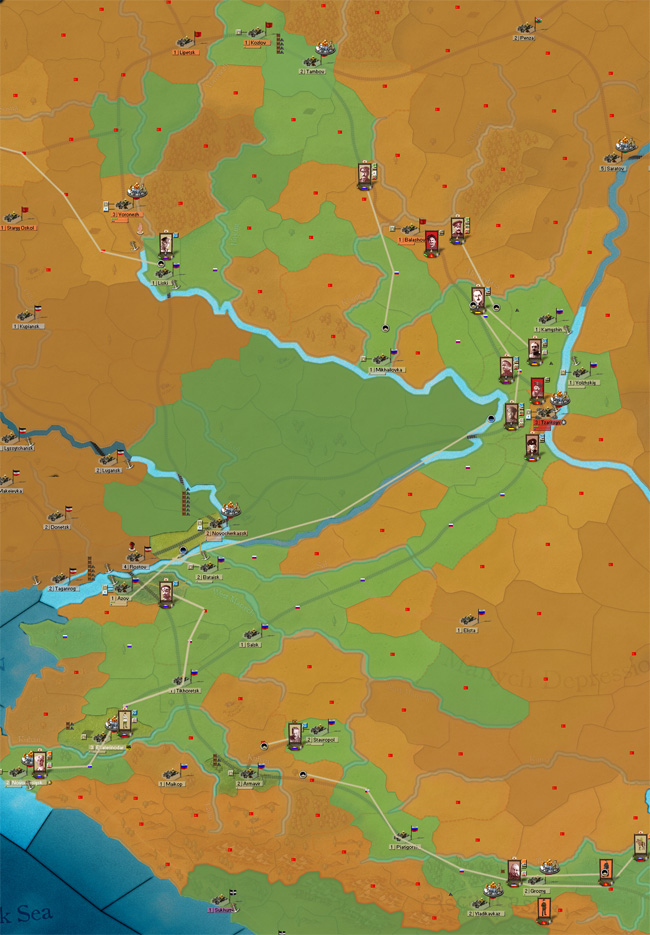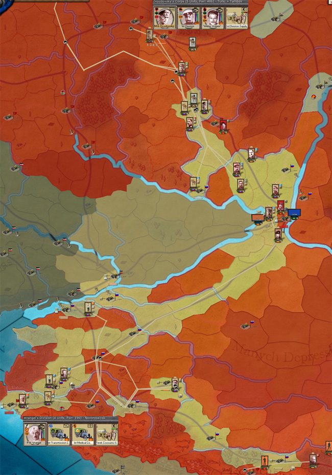 Late October, 1918: Soviet Taman Front was evacuated from Novorossiysk, and Wrangel is ordered to assault the now lightly defended city; Kutepov and Lukomsky prepare to assault Kalnin's forces in Stavropol; Drozdovsky took Tambov, and orders a forced march to Liski in preparation for an advance on Voronezh should Sorokin leave the city; cavalry is sent to scout the vicinity of Kursk; Volunteer Army and Mamontov's Column will attempt to secure Balashov while Trotsky is distracted by Drozdovsky.