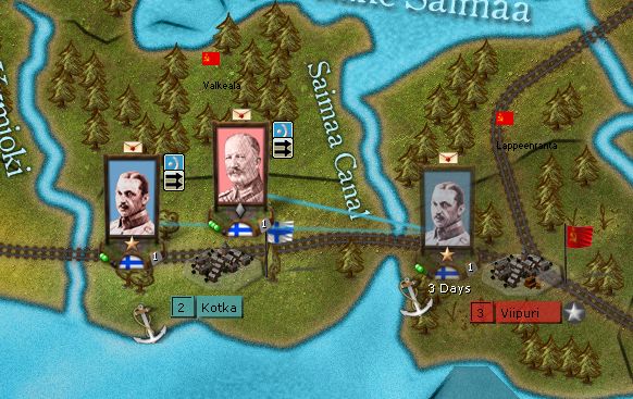 I tested this a little bit more and came to interesting results. On figure bellow you may see two different routes which can be used for attack on Viipuri. First one is direct Kotka -> Viipuri route (solid line arrow), where Army and subordinate Corps need to pass over Saimaa canal before attack. Second one is indirect route Kotka -> Laappenranta -> Viipuri (dashed line arrow).
