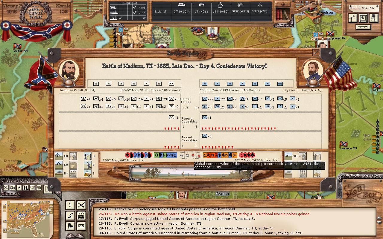 Gordon’s division stays in NO, there are no threats nearby. However, it seems right to end the game soon with a division there. NO was such an important city from the CSA.