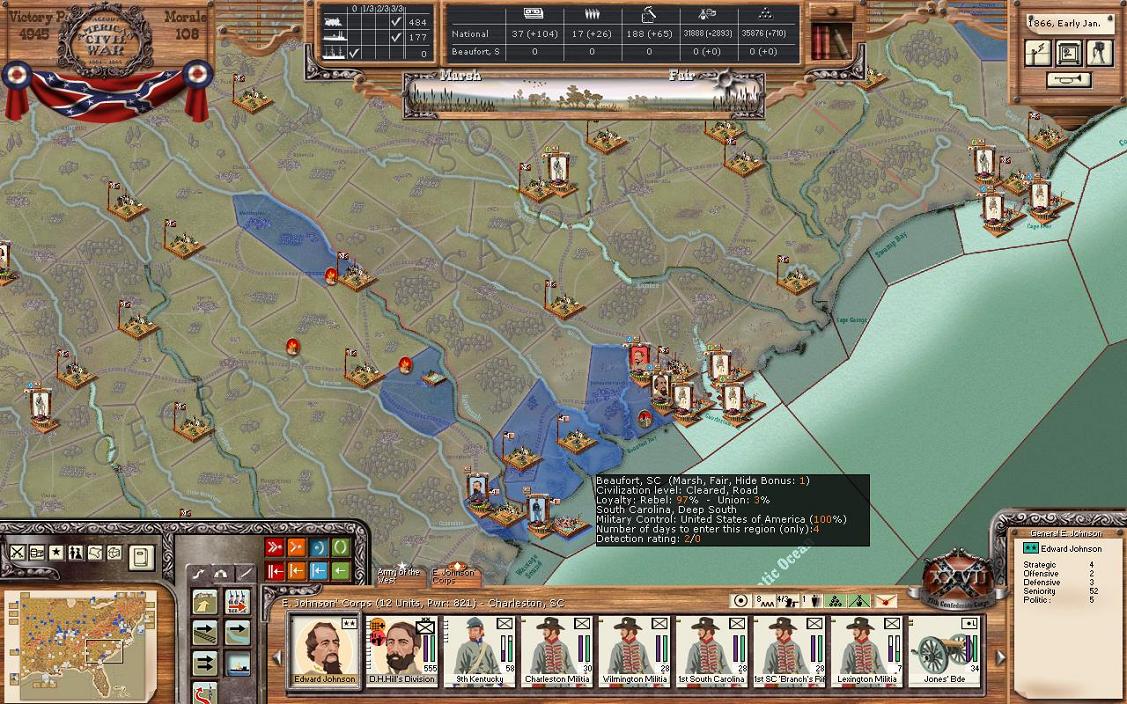 The Union moves in a division to Jasper. That leaves 4 divisions in Savannah and 1 in Augusta. At this point, I’m not sure what the Union is going to do, perhaps nothing. I am a little surprised the Union has tried to attack Charlestown with all 6 divisions in a coordinated attack. However, they haven’t, and they don’t seem to be interested in doing so at this point. Kearny’s force leaves South and heads to North Carolina.