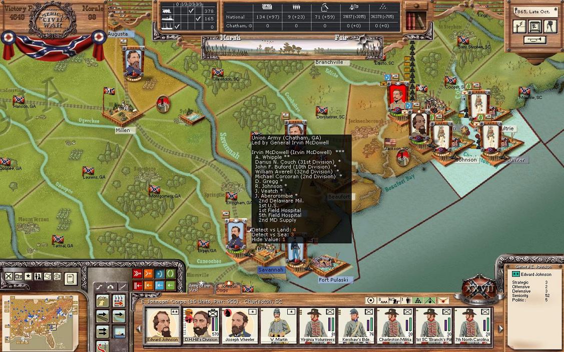 The Union moves in a division to Jasper. That leaves 4 divisions in Savannah and 1 in Augusta. At this point, I’m not sure what the Union is going to do, perhaps nothing. I am a little surprised the Union has tried to attack Charlestown with all 6 divisions in a coordinated attack. However, they haven’t, and they don’t seem to be interested in doing so at this point. Kearny’s force leaves South and heads to North Carolina.