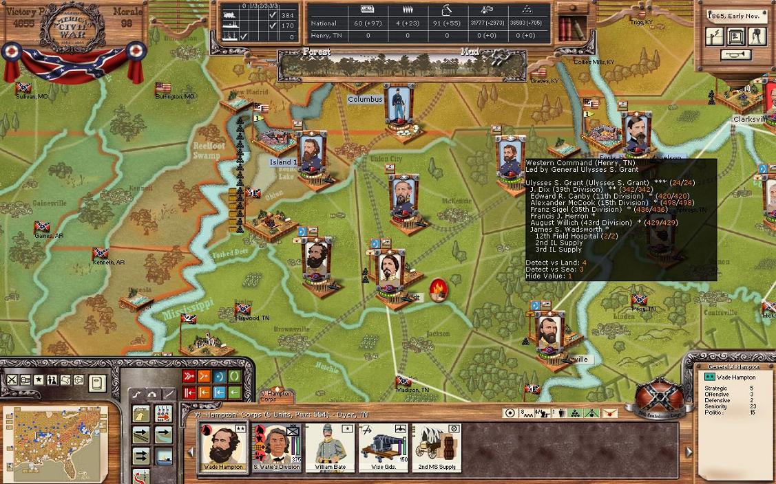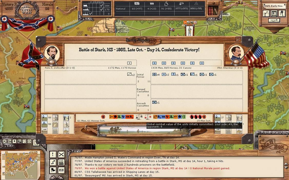 Gordon’s division stays in NO, there are no threats nearby. However, it seems right to end the game soon with a division there. NO was such an important city from the CSA.